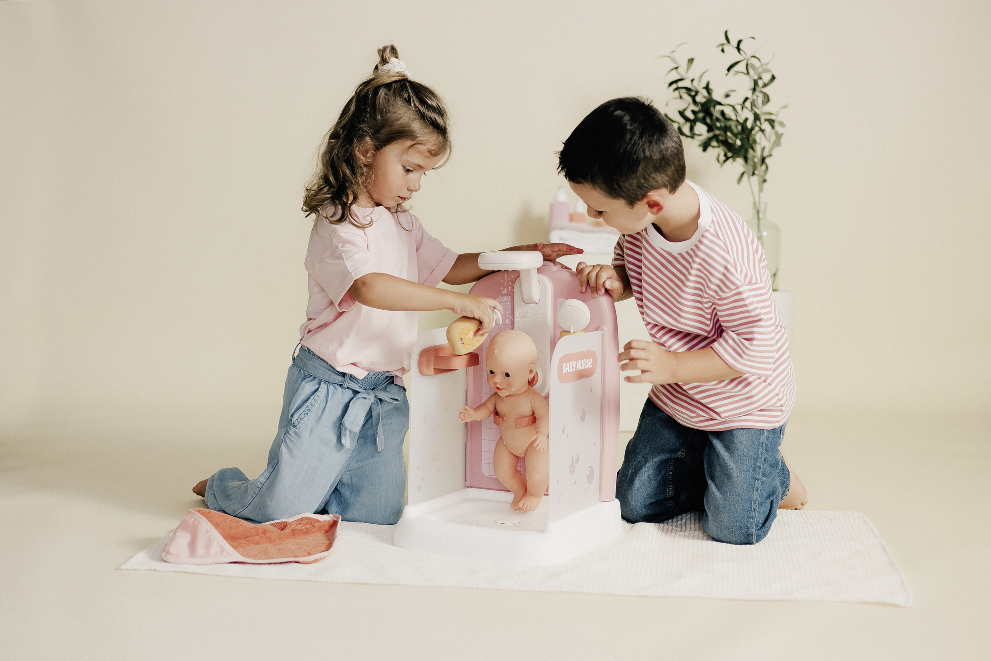 Prysznic posiada uchwyt podtrzymujący lalkę pod prysznicem, dzięki czemu lalka może sama stać. Po kąpieli dziecko może wytrzeć lalę i następnie zadbać o jej codzienną pielęgnację.