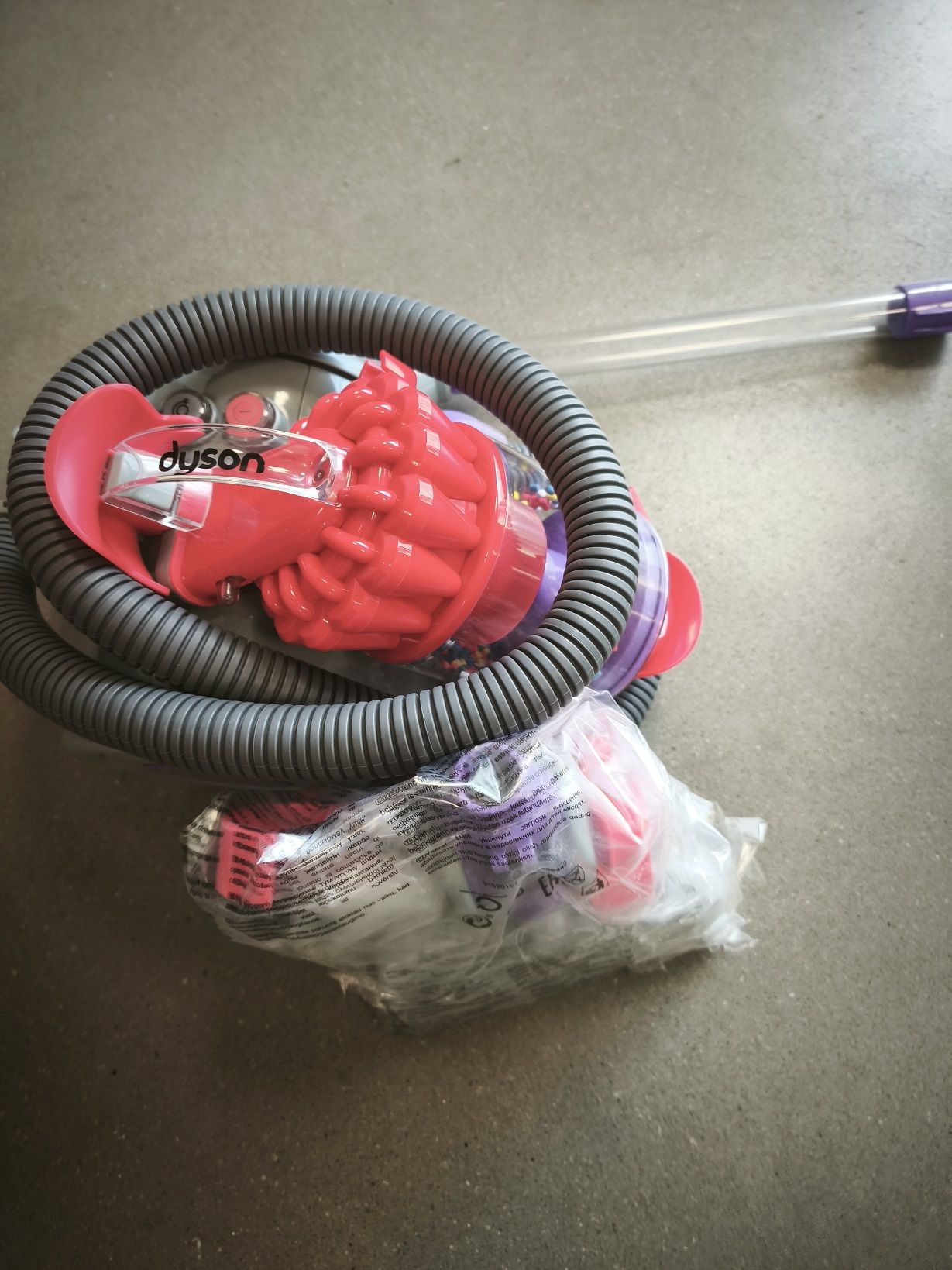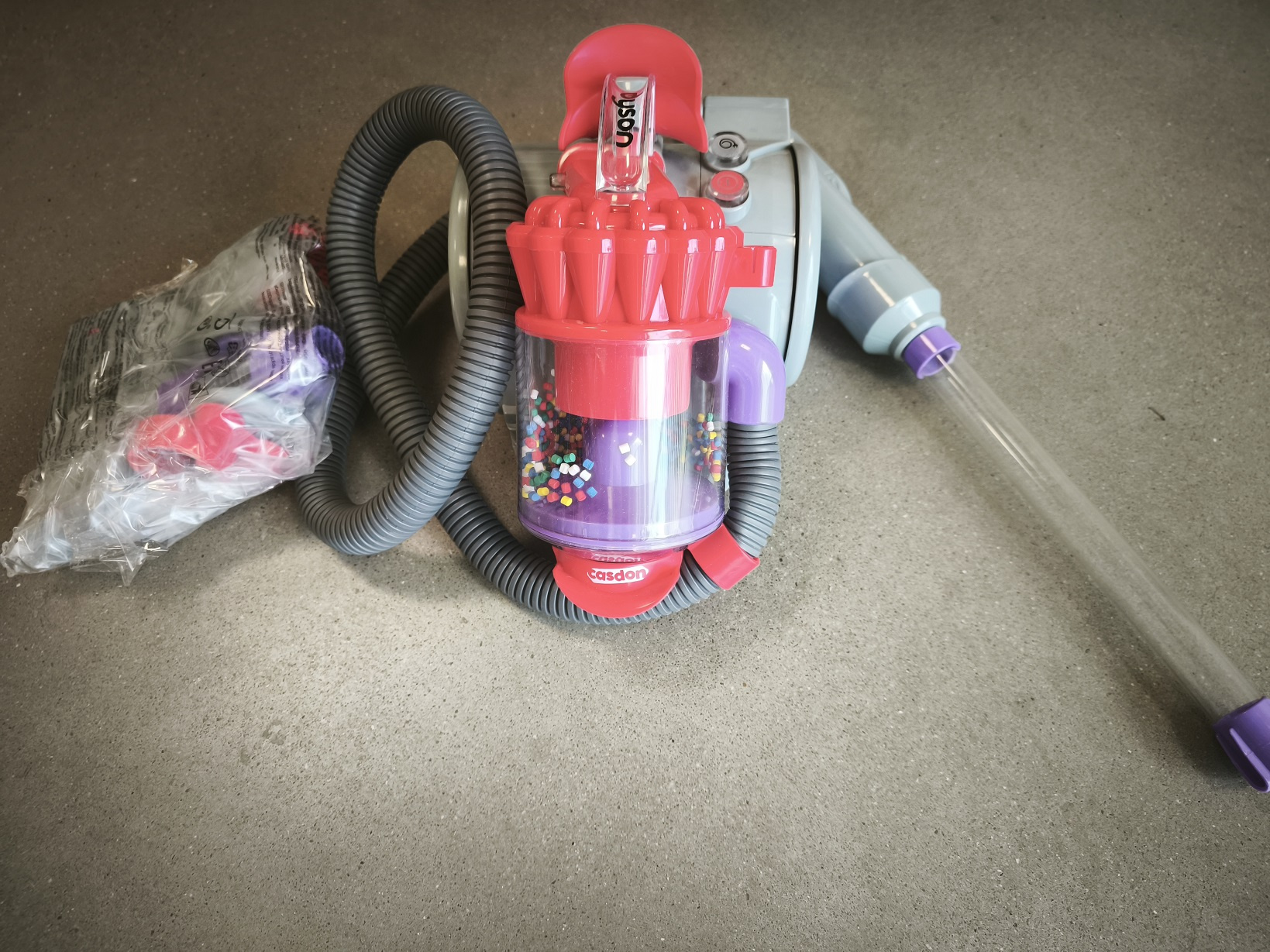 Odkurzacz Dyson działa jak prawdziwy odkurzacz, a po włączeniu wydaje dźwięki. Posiada zbiornik z wirującymi kolorowymi kuleczkami, oraz funkcję ssania, która pozwala posprzątać drobne kawałki np. papieru. Odkurzacz wciąga niewielkie, lżejsze śmieci do środka. Jest to odkurzacz-zabawka i jego siła ssąca jest dużo mniejsza , niż prawdziwego odkurzacza. Zabawka idealnie sprawdzi się jako narzędzie do zabawy w dom i zaangażuje dziecko w sprzątanie. Odkurzacz posiada pojemniczek na śmieci, który można samemu opróżniać. Po włączeniu zabawki dziecko może obserwować cyklonową akcję.