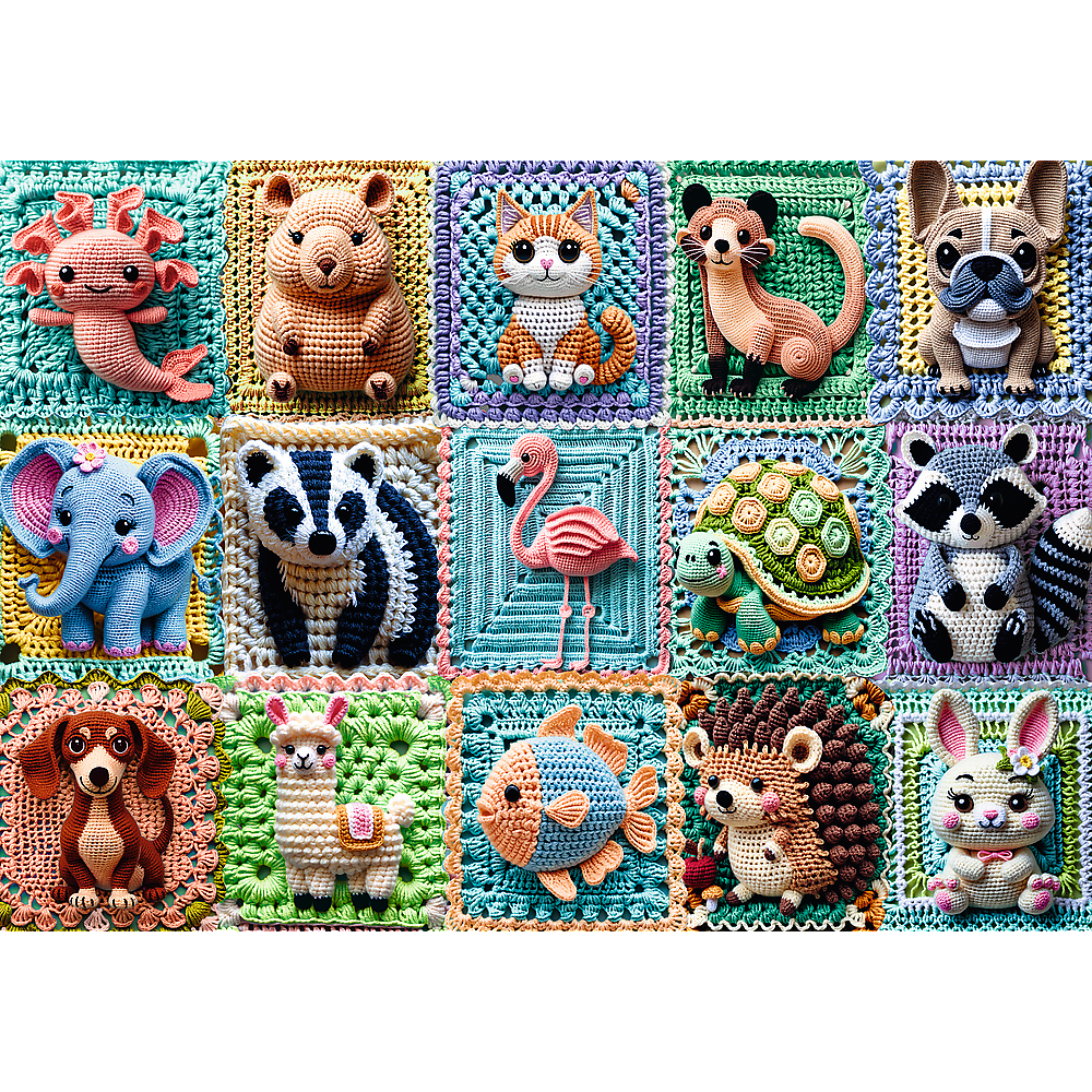 - Zestaw składa się z 1000 elementów i umożliwia stworzenie przepięknego obrazka przedstawiającego urocze szydełkowe zwierzątka.