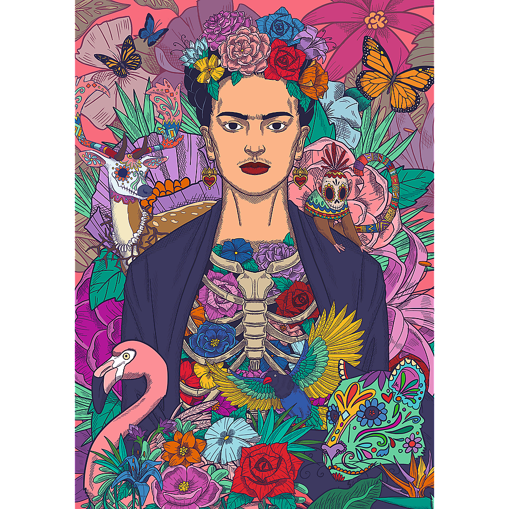 - Zestaw składa się z 1000 elementów i umożliwia stworzenie przepięknego obrazka przedstawiającego Fridę Kahlo.
