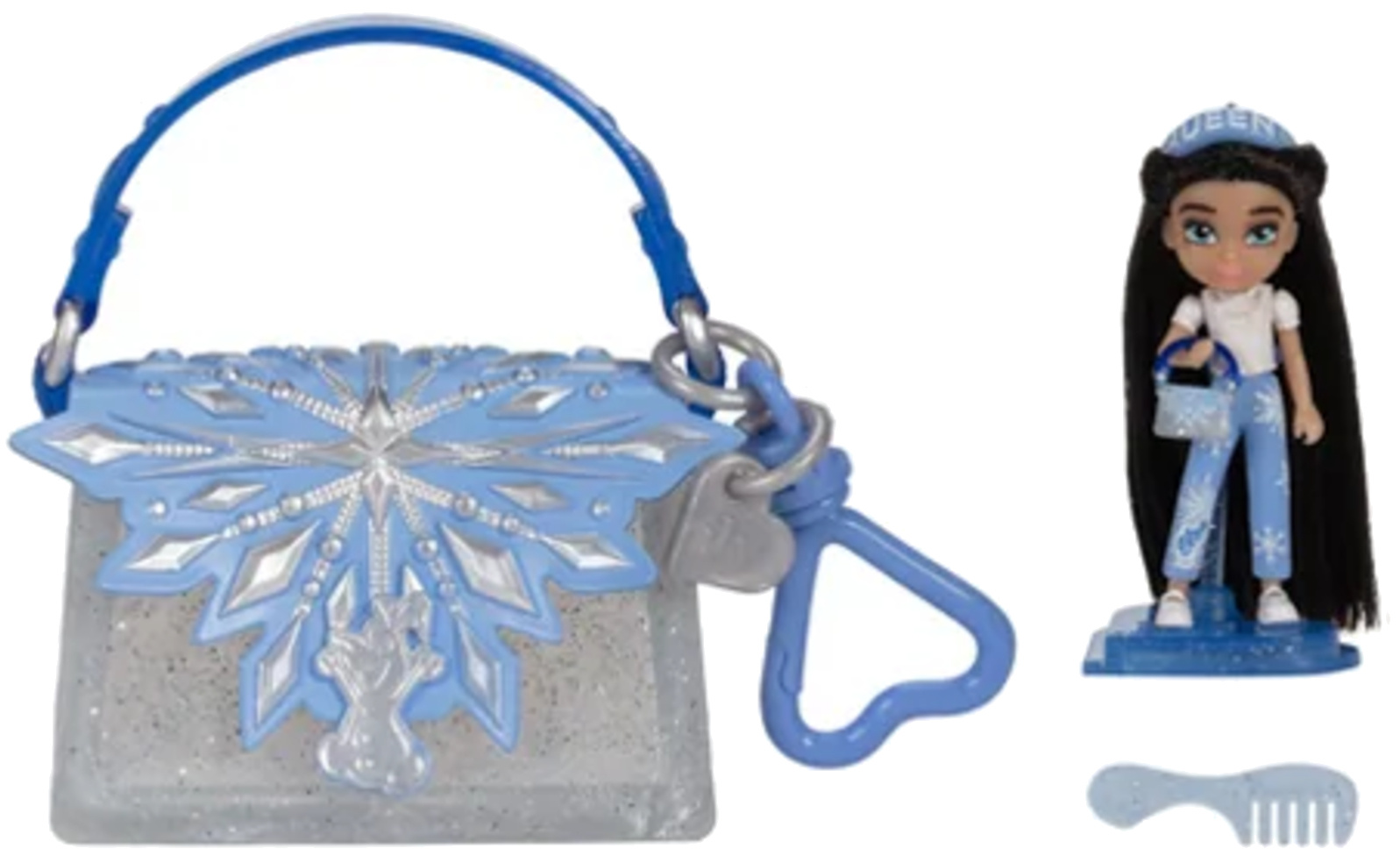 W zestawie znajduje się mini lalka z długimi, ciemnymi włosami, ubrana w błękitno-biały strój z motywem płatków śniegu. Stylizację uzupełniają sportowe buciki i mini torebeczka z płatkiem śniegu.