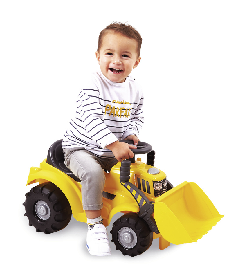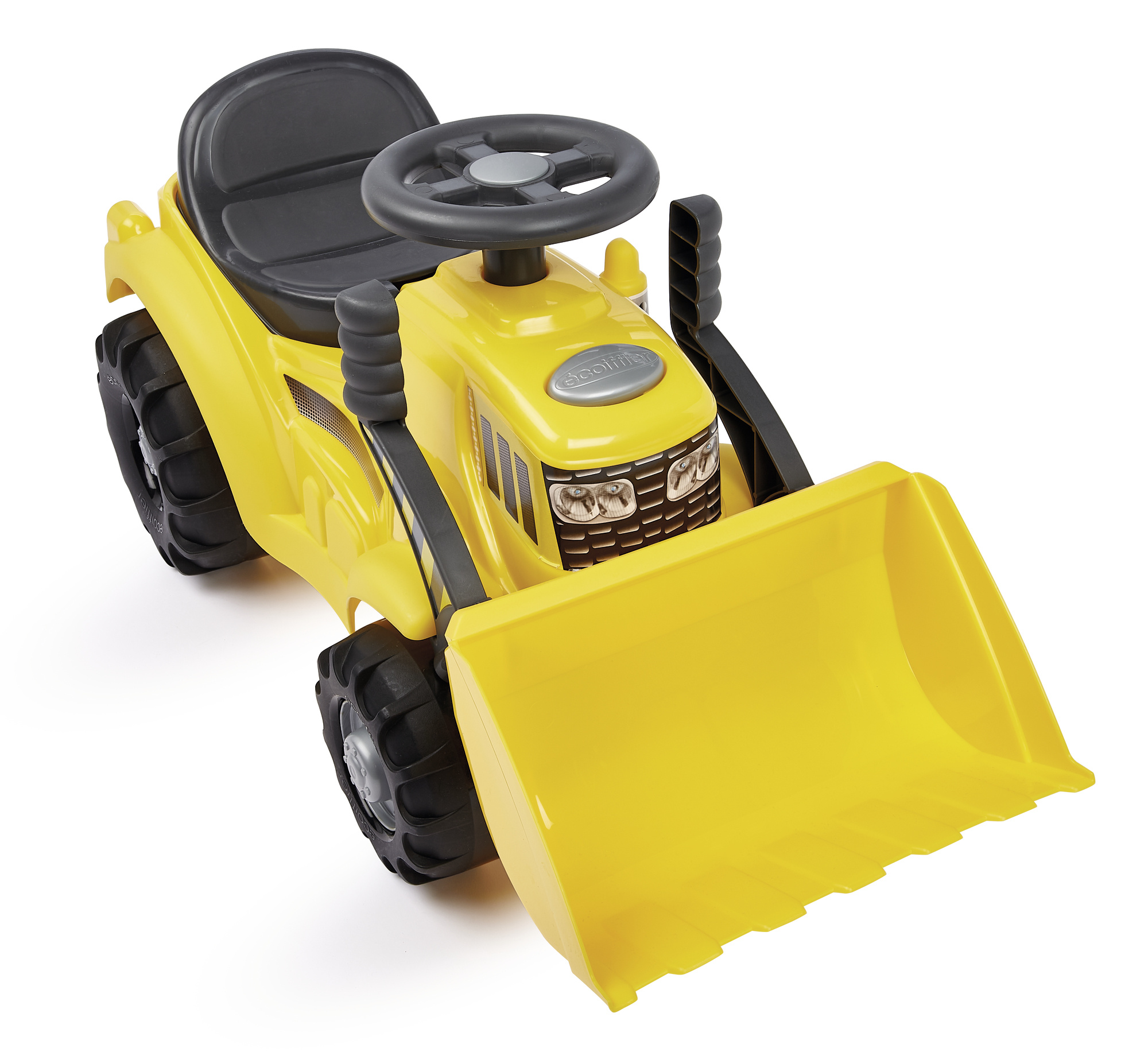 Pojazd posiada siedzenie odpowiednie dla dzieci a w wieku od 12 do 36 miesięcy ze schowkiem na skarby, ruchome koła i łyżkę spychacza sterowaną uchwytami po obu stronach kierownicy.