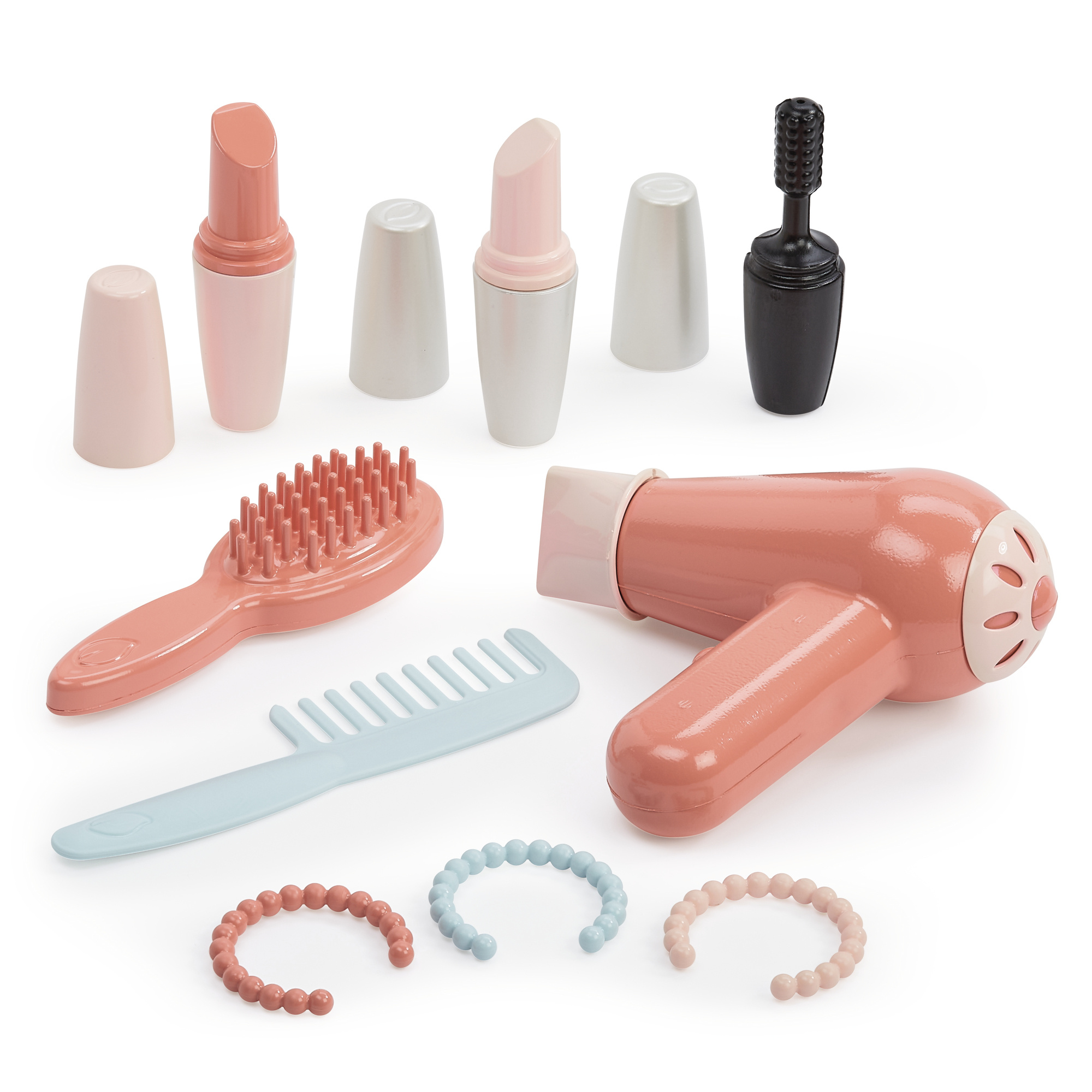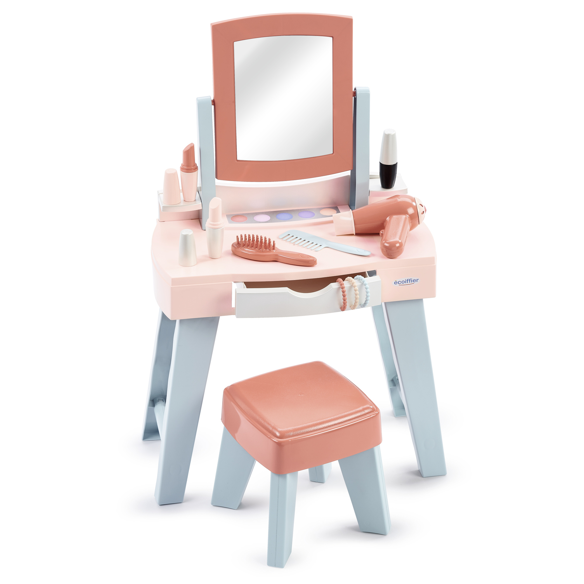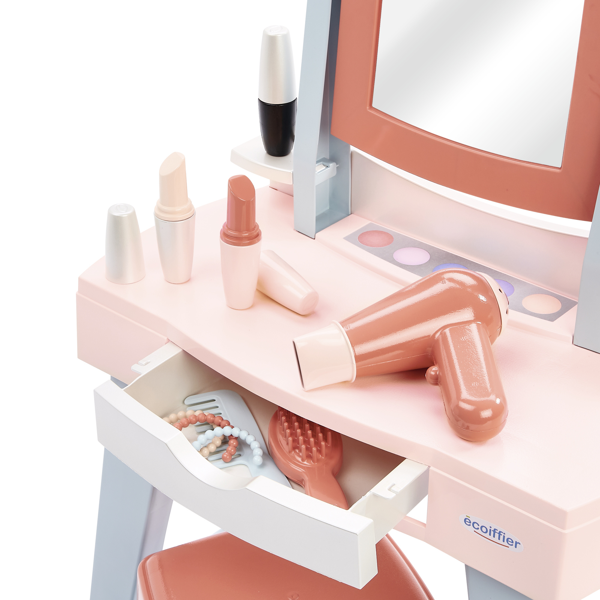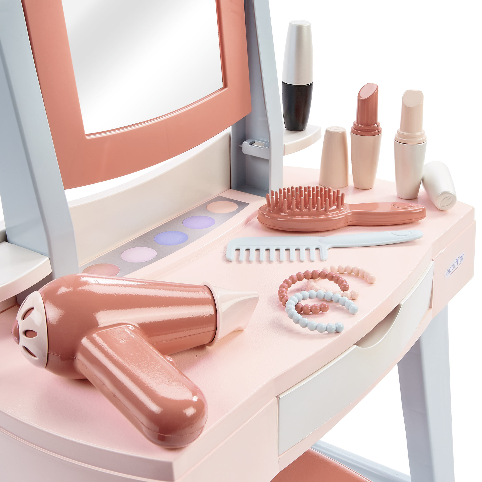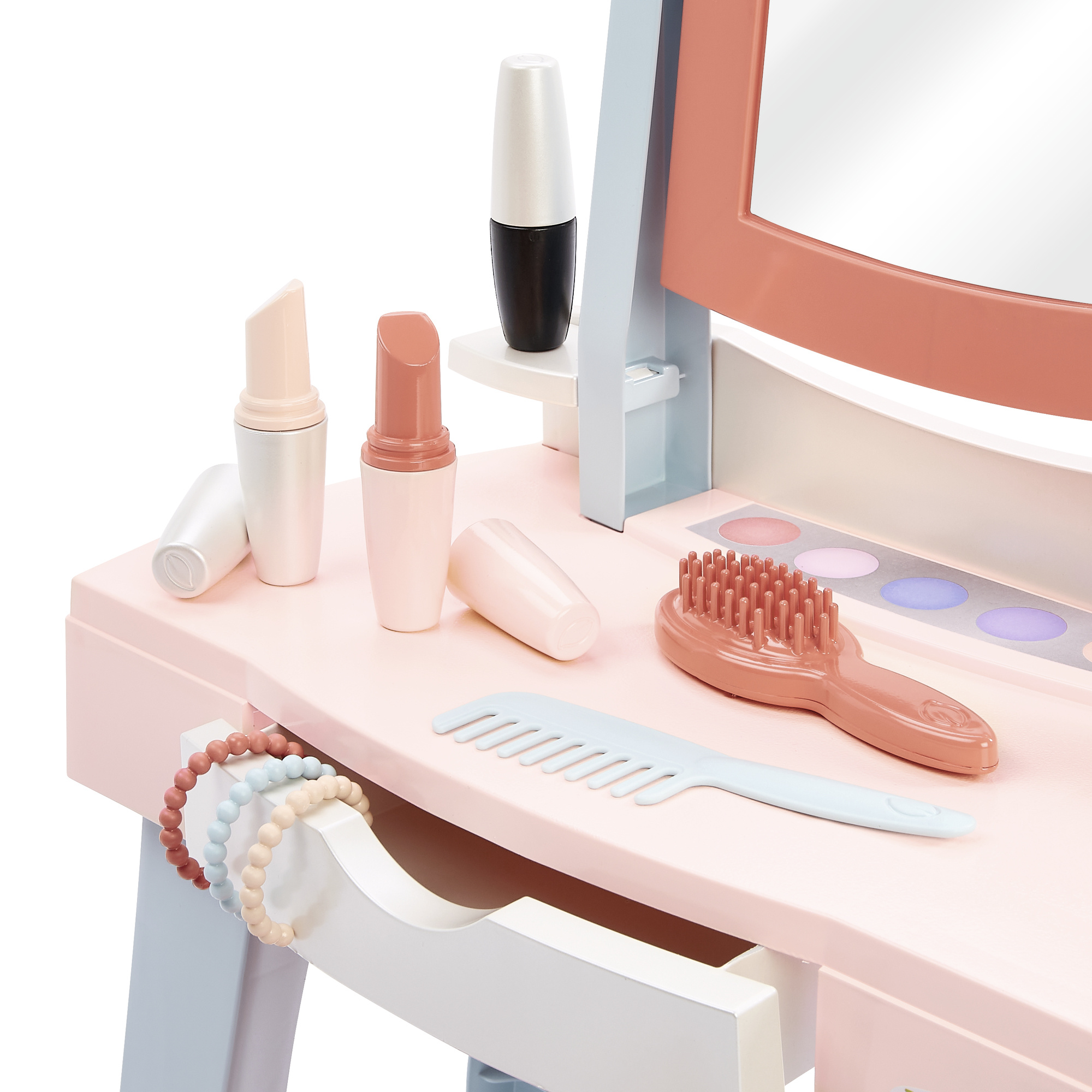 Bogaty zestaw akcesoriów: Dopełnieniem są przybory do pielęgnacji – grzebień, szczotka, suszarka, szminki, tusz do rzęs, imitacja cieni do powiek i bransoletki. Natomiast rozsuwana szufladka umożliwia odpowiednie przechowywanie akcesoriów.