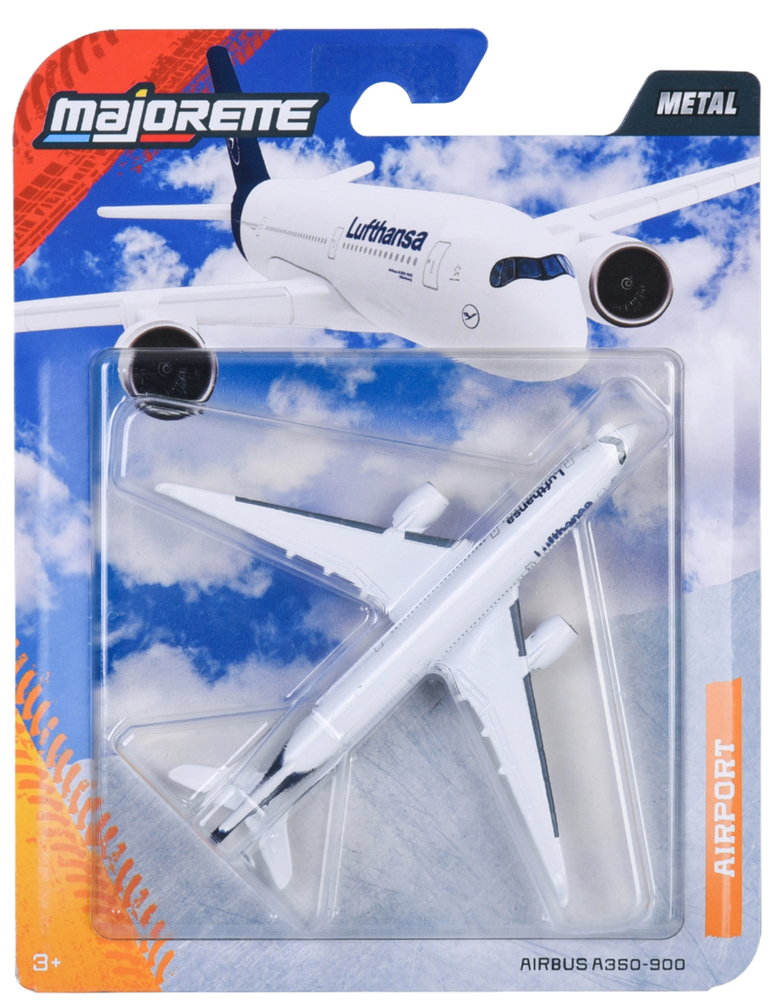 - W opakowaniu znajdziemy samolot pasażerski Airbus A350-900 Lufthansa. Został wykonany z metalu. Posiada charakterystyczne znaki oraz kolory.