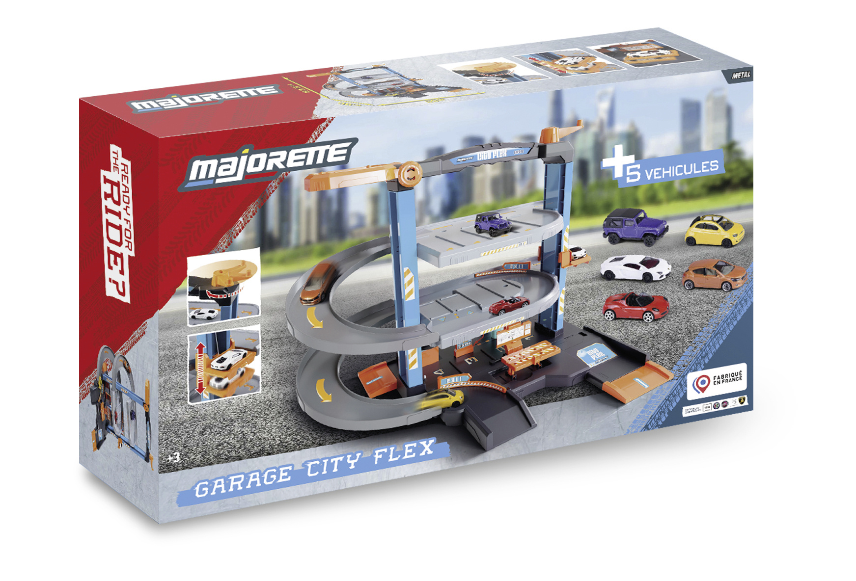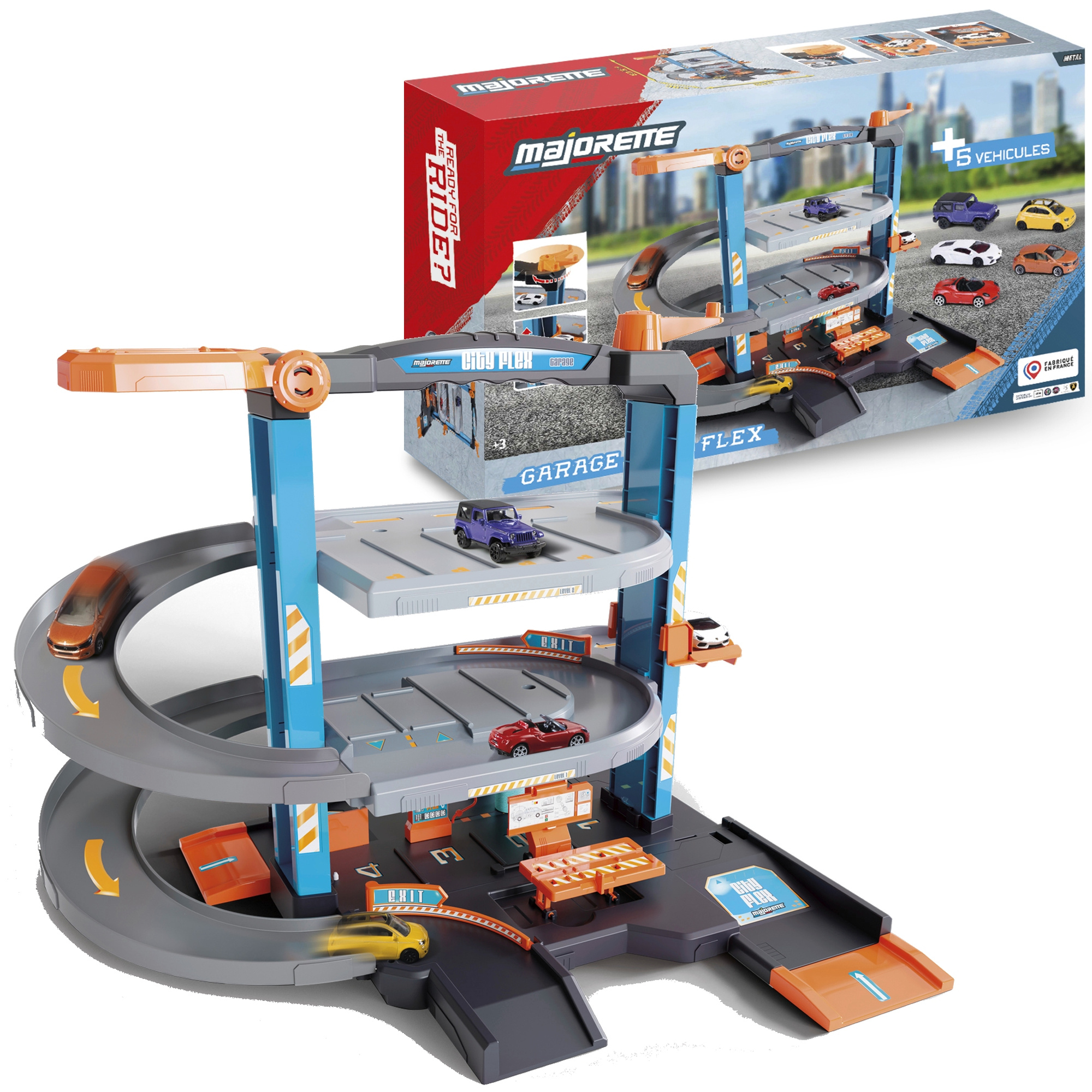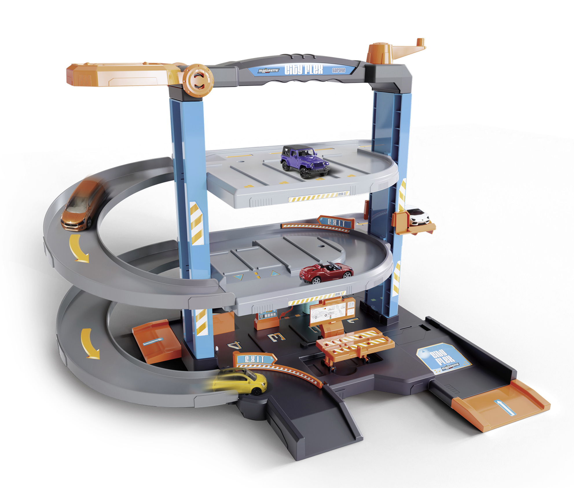 Zabawka ta to wspaniały zestaw składający się z 3-poziomowego parkingu samochodowego oraz 5 autek typu resorak. Na wszystkich piętrach znajdują się miejsca parkingowe dla aż 8 pojazdów. Całość została dodatkowo wyposażona w serwis naprawy aut i stację benzynową. Między piętrami znajdują się rampy, po których pojazdy mogą wjeżdżać oraz szybciej wyjeżdżać z garażu. Dodatkowo na każde piętro można wjechać windą, która przesuwa się za pomocą pomarańczowej korbki. Na samym dole zabawki przyłączona została imitacja prawdziwej ulicy.
