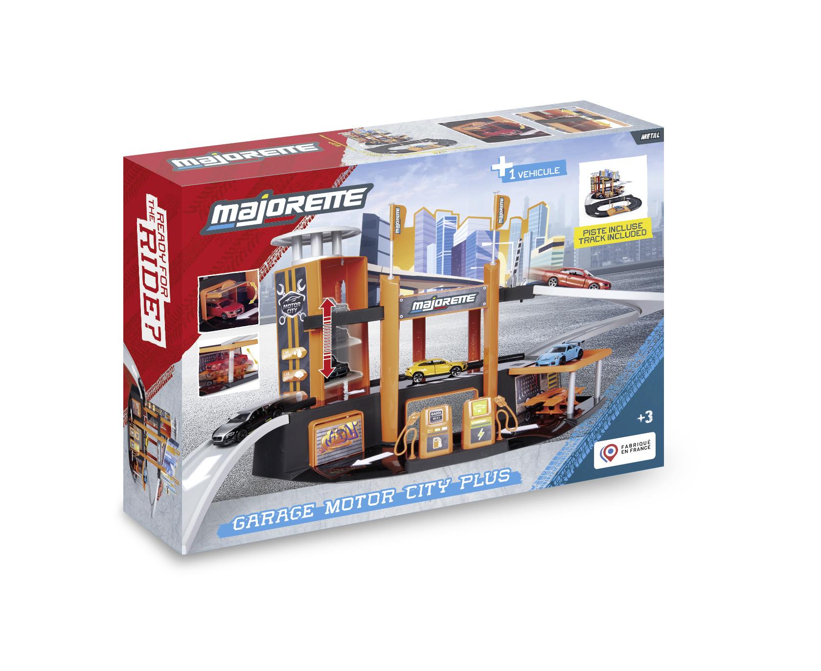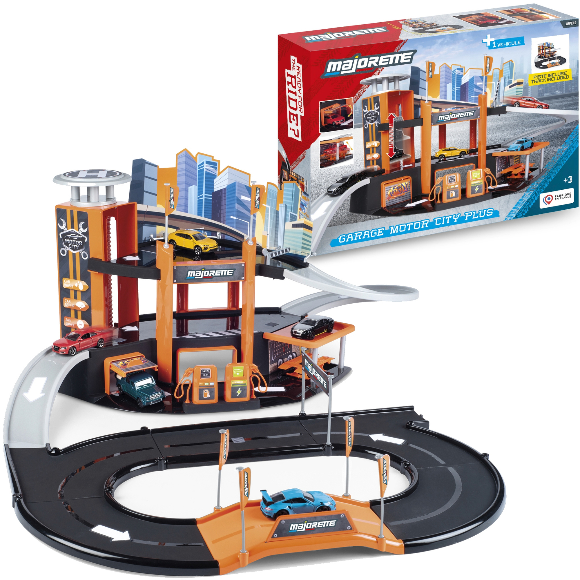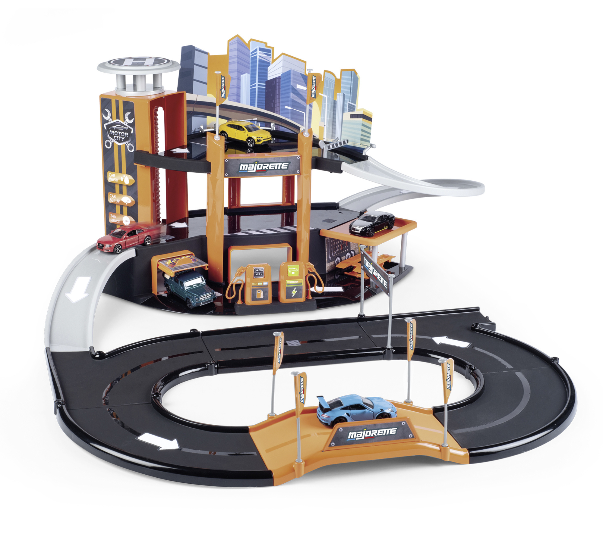 Zabawka ta to wspaniały zestaw składający się z 3-poziomowego parkingu samochodowego oraz autka typu resorak. Przez całą długość parkingu prowadzi zjeżdżalnia, którą można wyjechać na pętlę, dołączoną do zestawu. Całość została dodatkowo wyposażona w serwis naprawy aut i stację benzynową z możliwością ładowania nawet elektrycznych aut. Ponad to, na każde piętro, można dostać się za pomocą windy. Na samym dole zabawki można przyłączyć ulicę tworzącą pętlę.