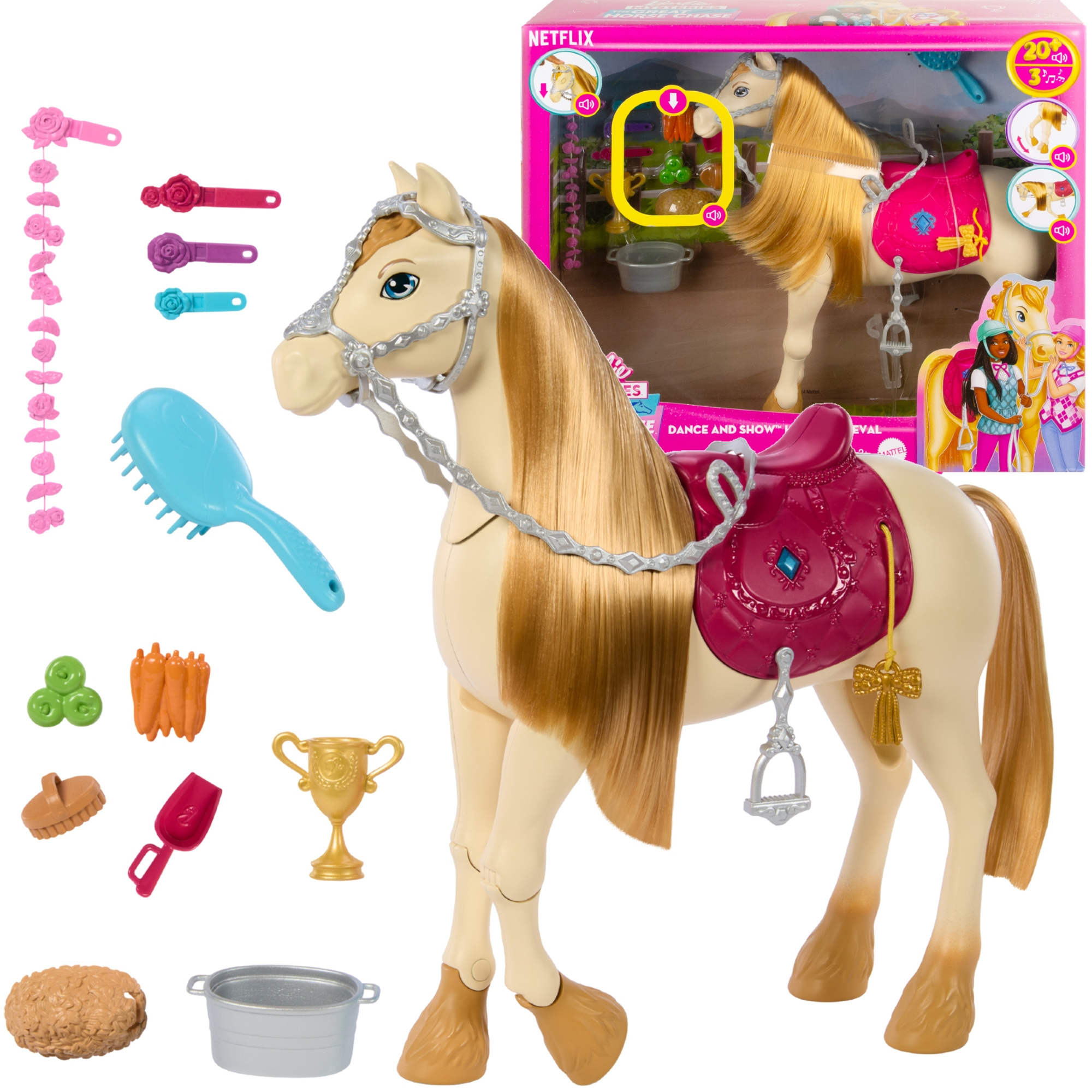 Konik Tornado z serialu Netfliksa „Barbie Mysteries: The Great Chase - Zagadki Barbie: Wielki pościg” to interaktywny model konia, który zapewnia dzieciom mnóstwo kreatywnej zabawy. Konik posiada ponad 20 dźwiękowych aktywacji, dzięki którym „tańczy”, mruga oczami, odtwarza melodie inspirowane serialem oraz wydaje wesołe końskie odgłosy.