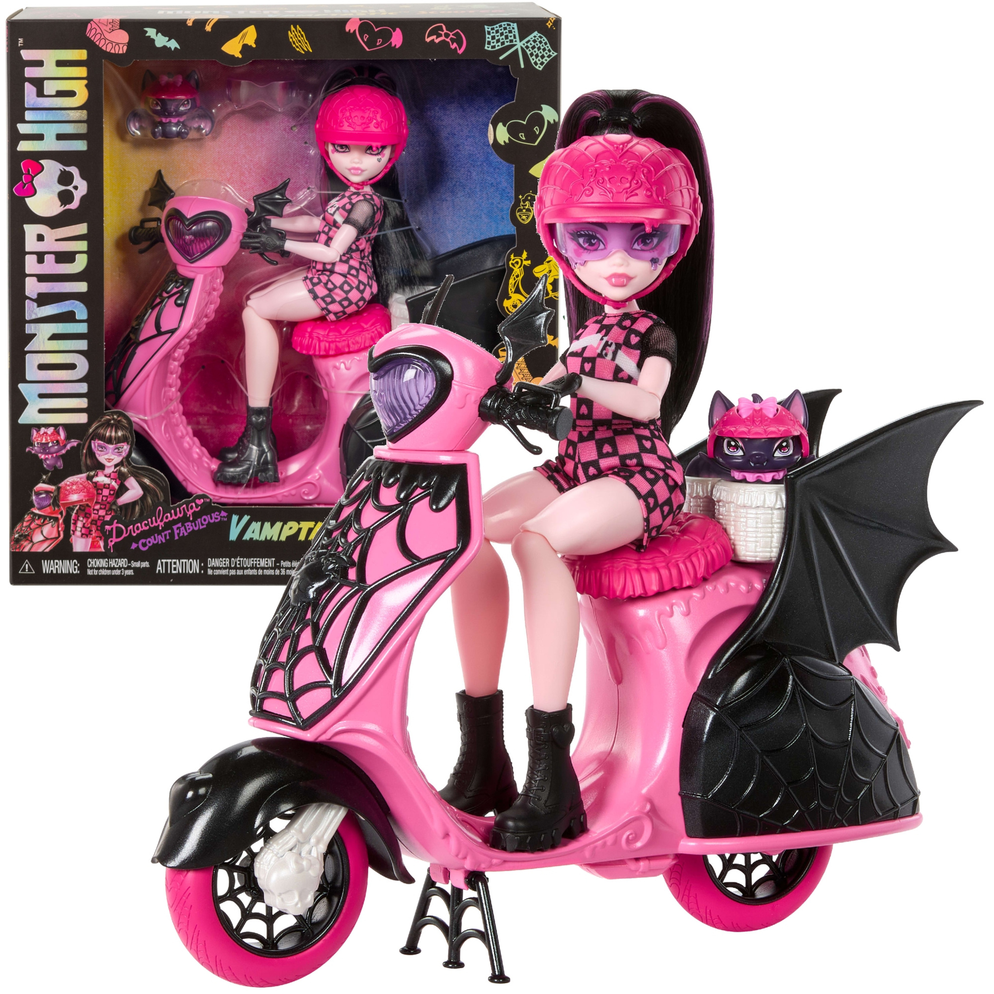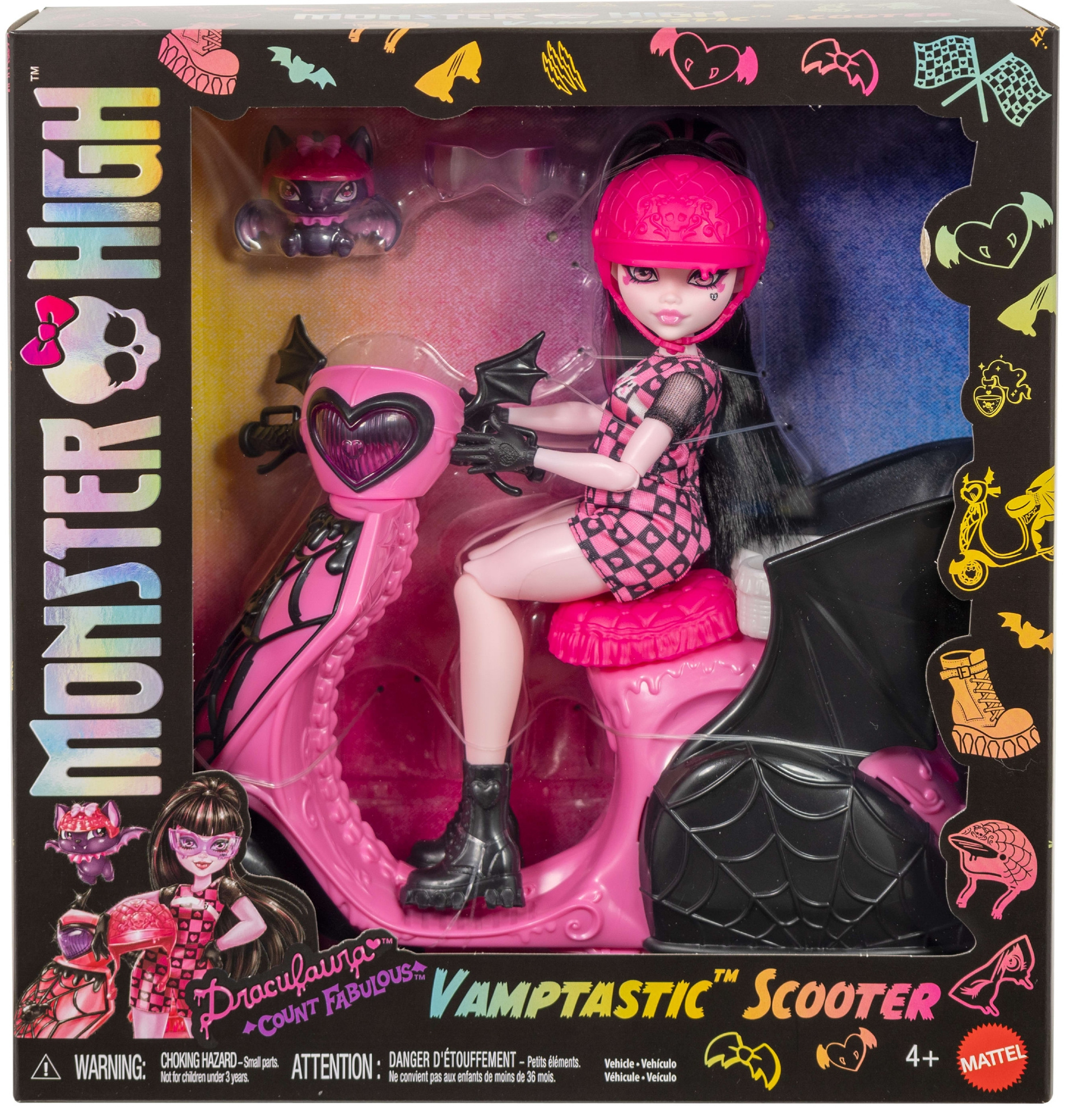 - Lalka Draculaura jest gotowa na odjazdową przejażdżkę na różowo-czarnym skuterze, a jej wierny towarzysz, nietoperz Hrabia Bajeczny, podróżuje razem z nią.