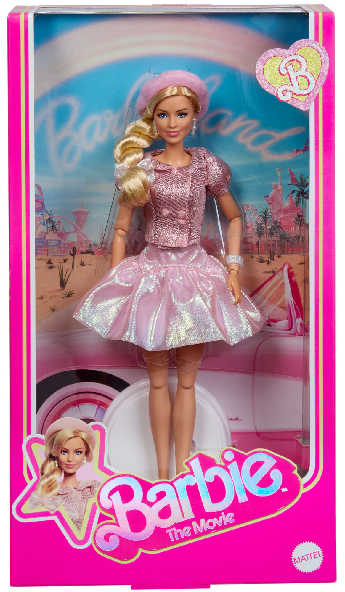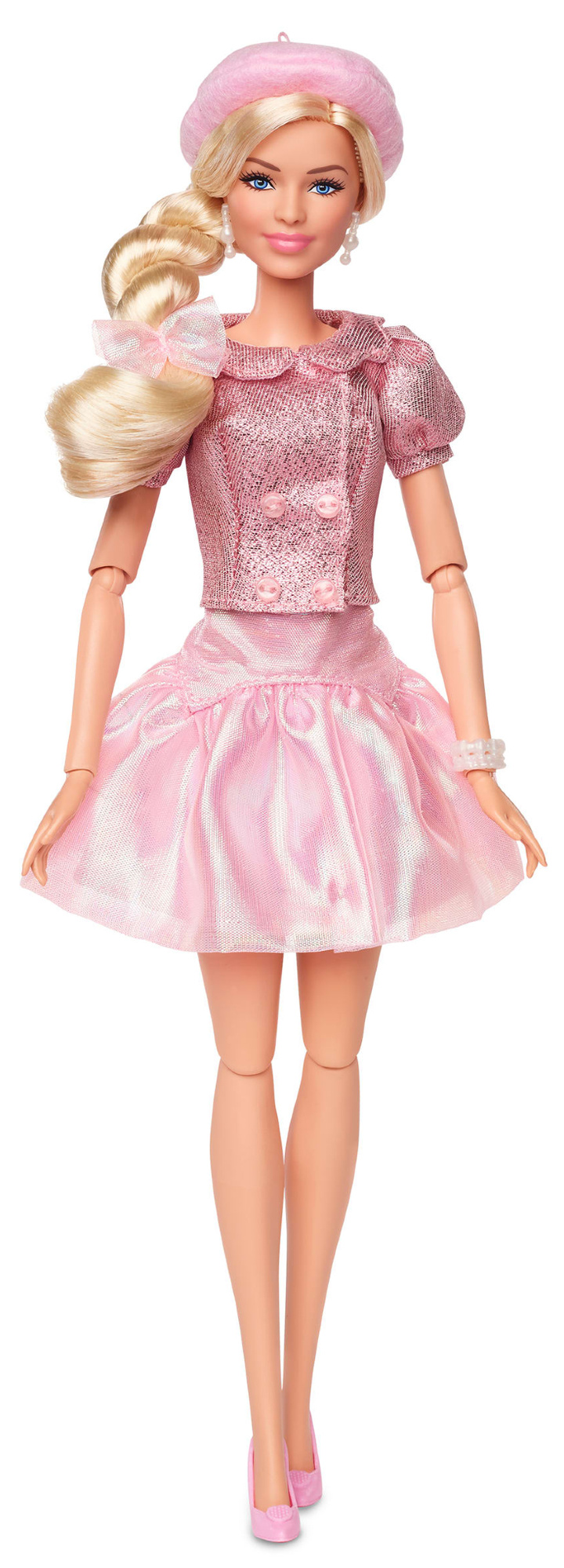 Ta wyjątkowa blondynka z niebieskimi oczami prezentuje się w świecącej różowej sukience inspirowanym klasyczną stylizacją głównej postaci z popularnego filmu Barbie. Dodatkowo, na głowie ma założony różowy berecik, a modnie wyglądające, wysokie buty na obcasie podkreślają jej elegancki wygląd, tworząc niepowtarzalny zestaw do stylizacji i zabawy dla fanów i kolekcjonerów. W zestawie znajduje się także biała podstawka, na której możemy ustawić lalkę.