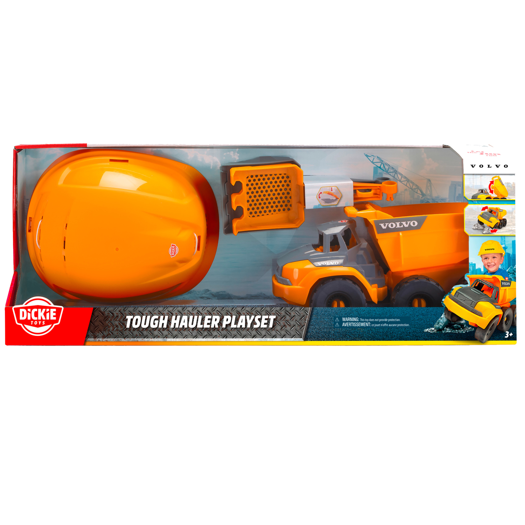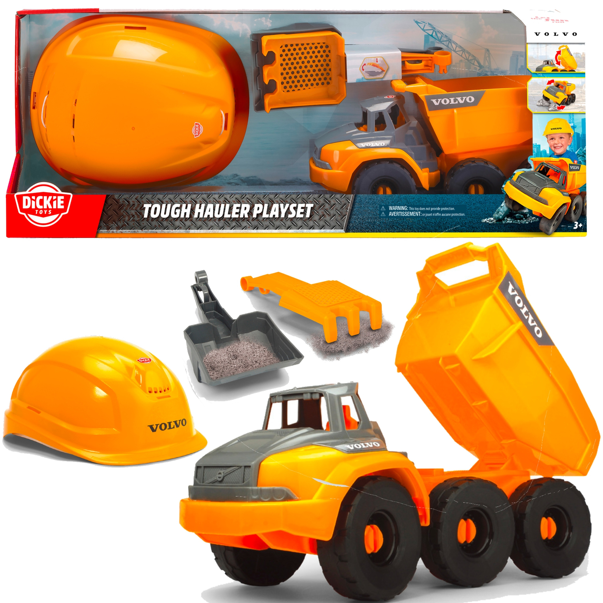 - Zestaw Volvo Pojazd budowlany Wywrotka Auto Akcesoria + Kask Ochronny, zawiera łopatkę i grabki. Wywrotka posiada ruchomą tylną klapę, wymiary auta 26x 11 x 14 cm, wymiary opakowania 54,5 x 12 x 19,5 cm