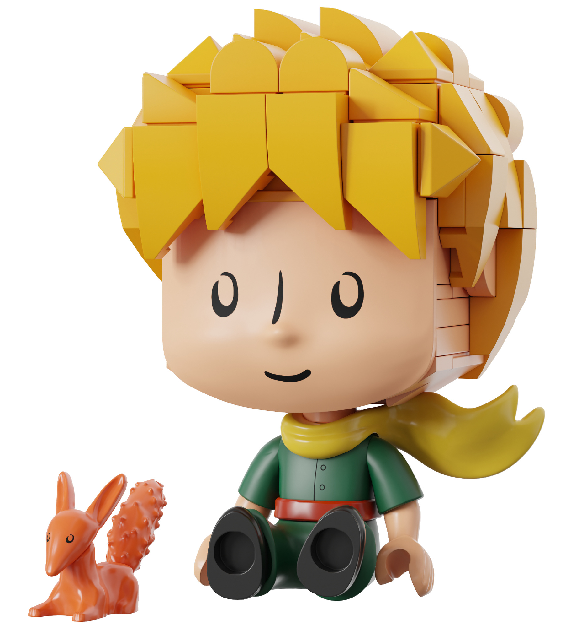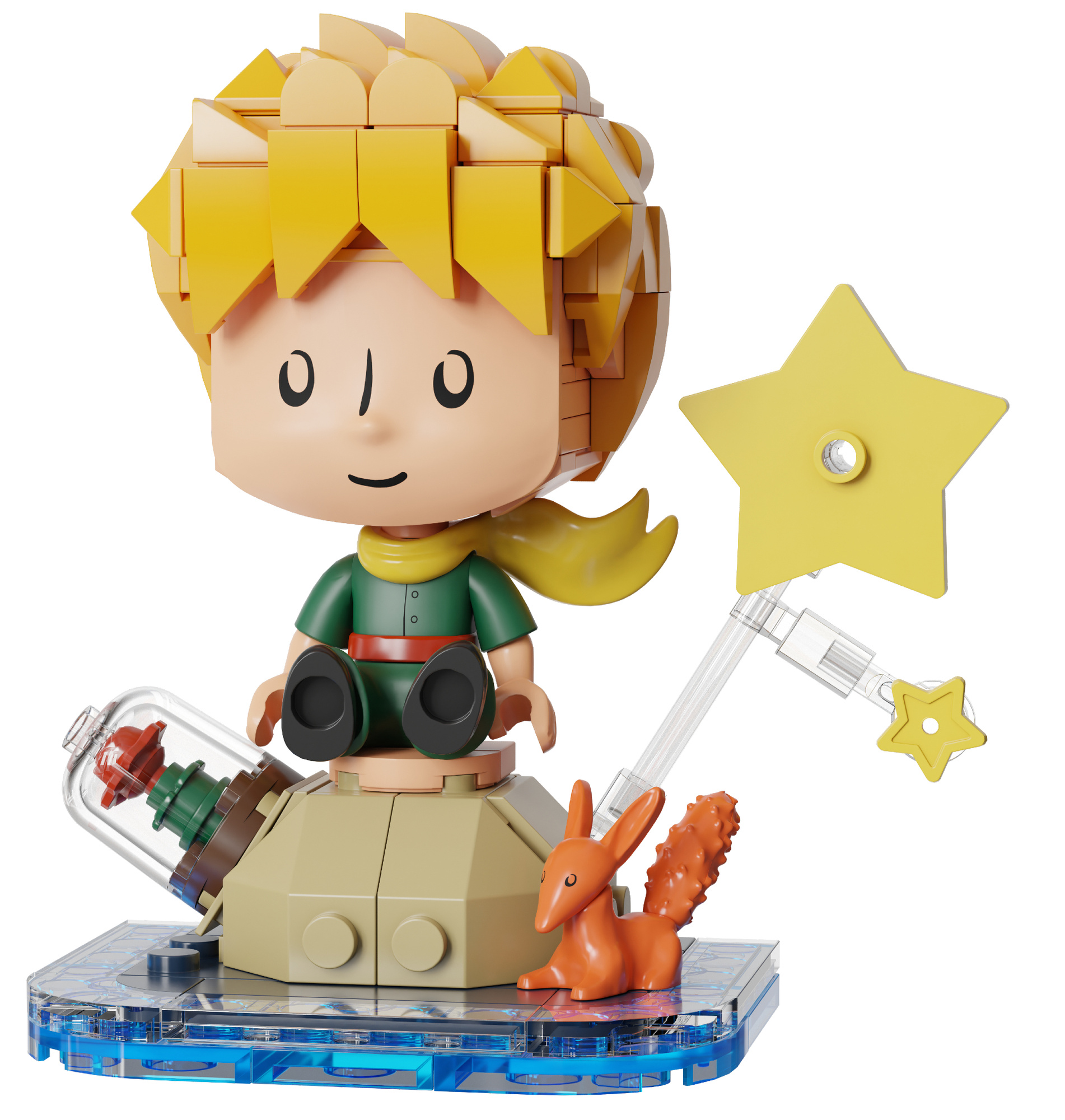 Zestaw po złożeniu przedstawia Małego Księcia siedzącego razem z lisem.