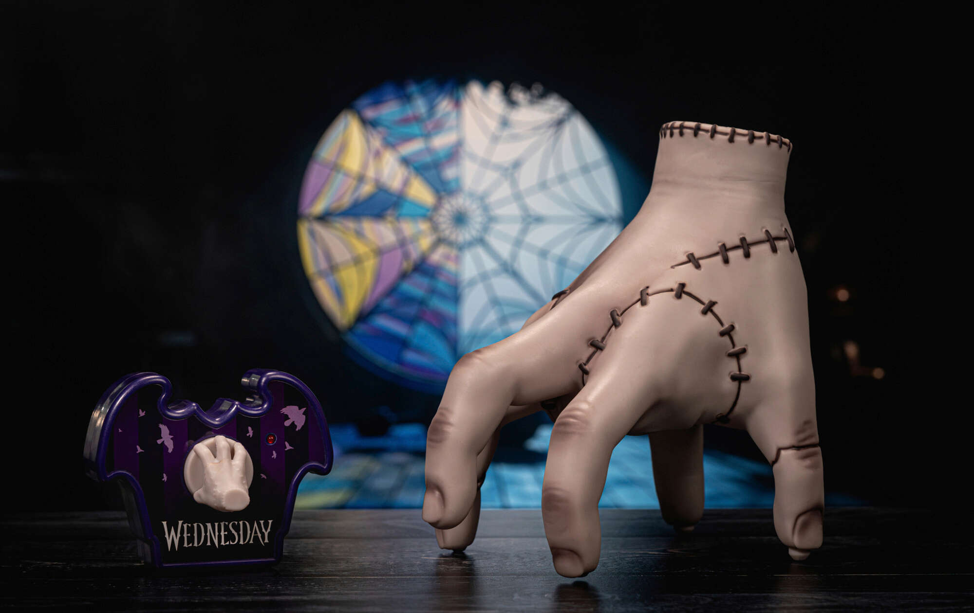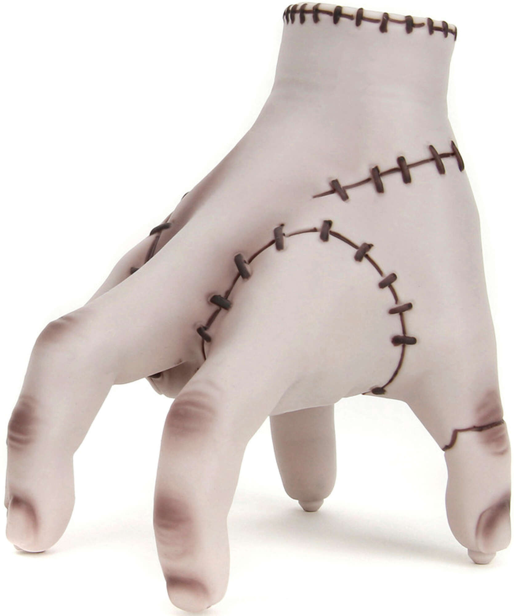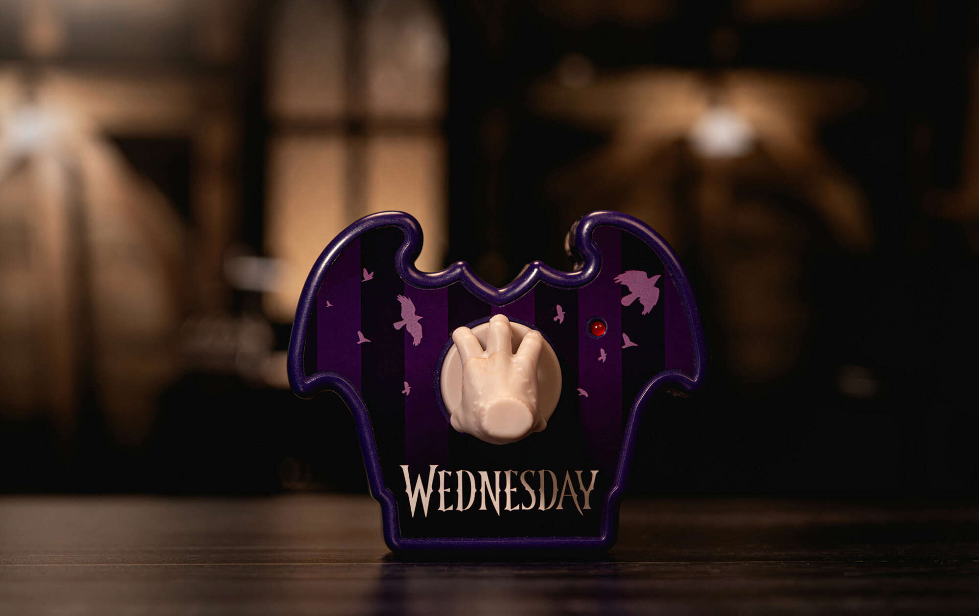 - W opakowaniu znajduje się figurka z popularnego filmu Wednesday - Rączka o wysokości około 16 cm. W zestawie znajduje się także pilot do zdalnego sterowania, w kształcie fioletowego nietoperza z małą podobizną Rąsi, jako joystick.