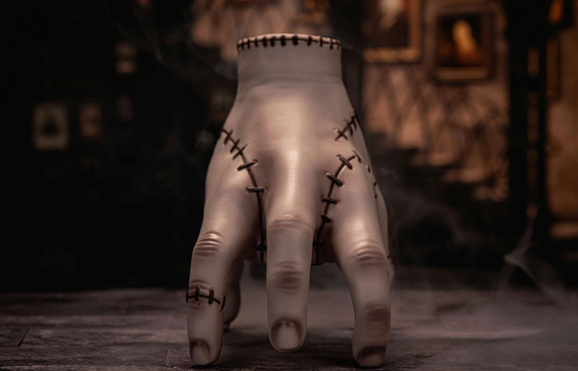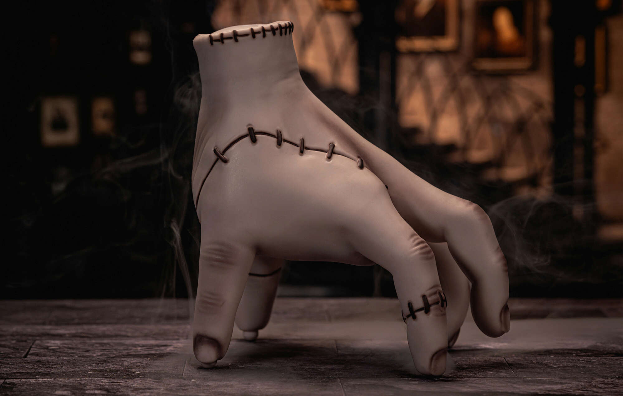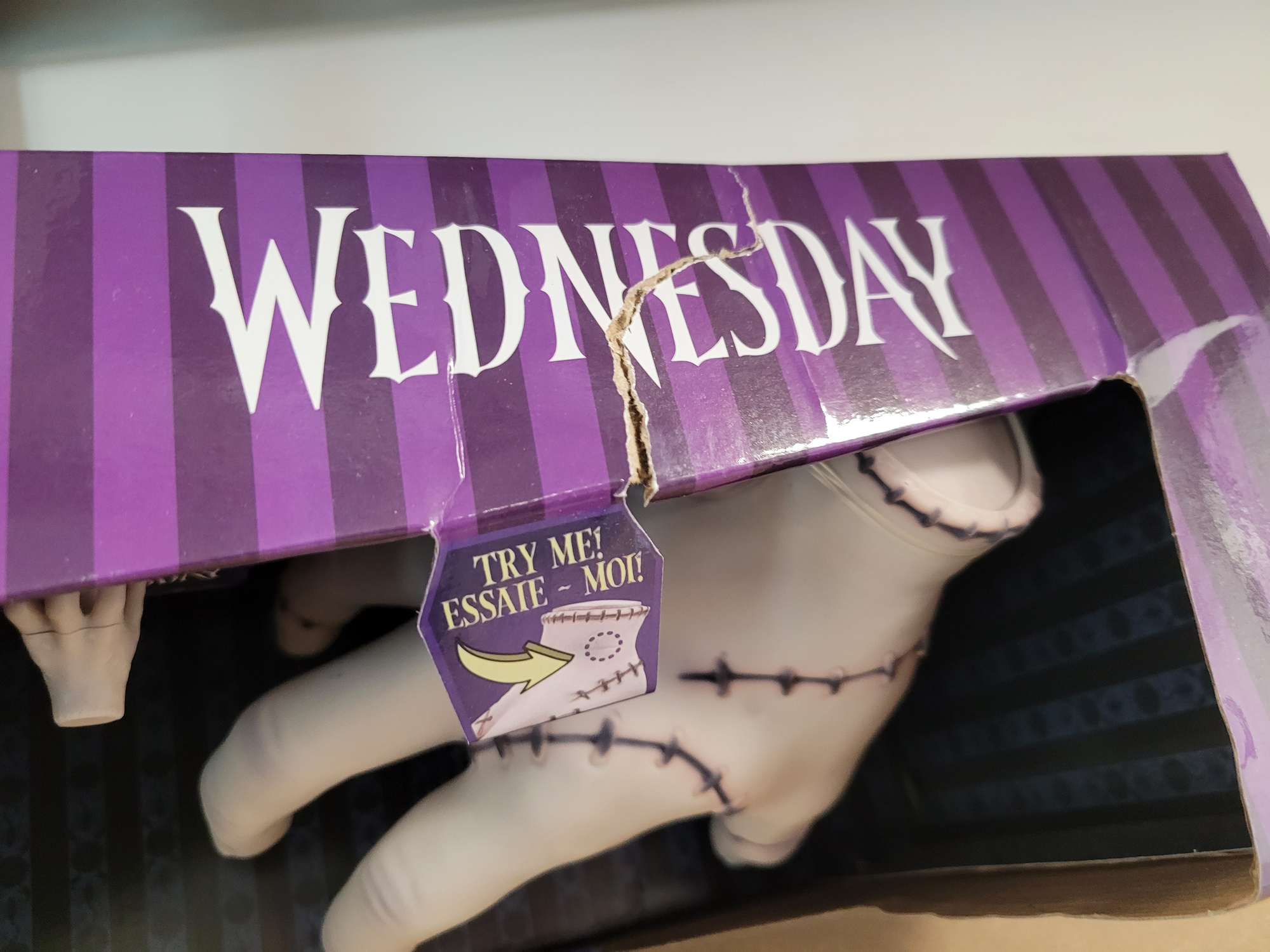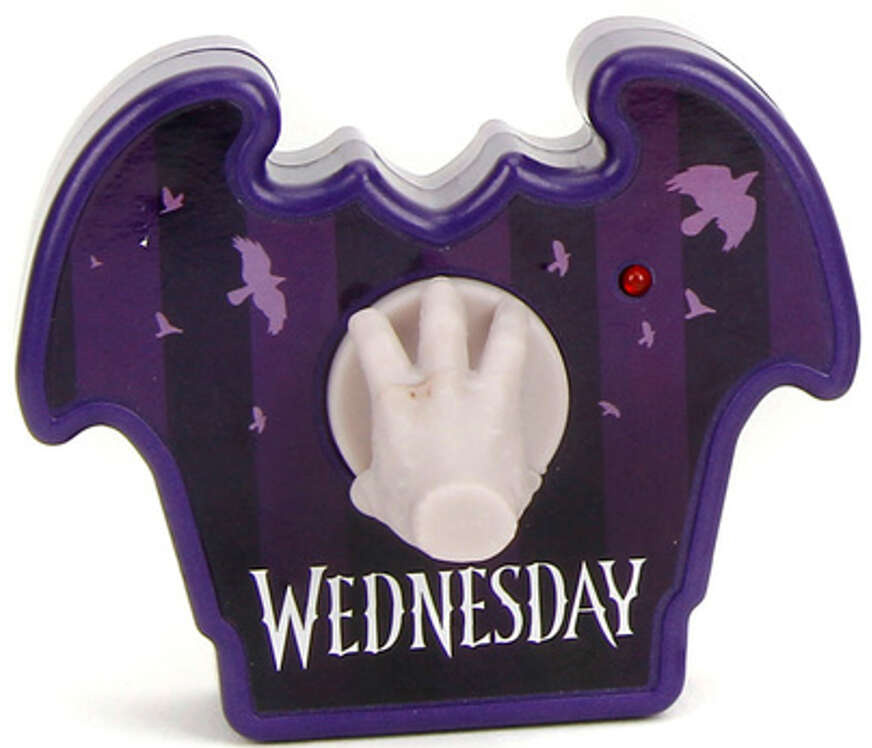 - W opakowaniu znajduje się figurka z popularnego filmu Wednesday - Rączka o wysokości około 16 cm. W zestawie znajduje się także pilot do zdalnego sterowania, w kształcie fioletowego nietoperza z małą podobizną Rąsi, jako joystick.