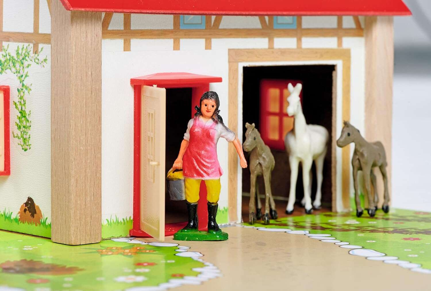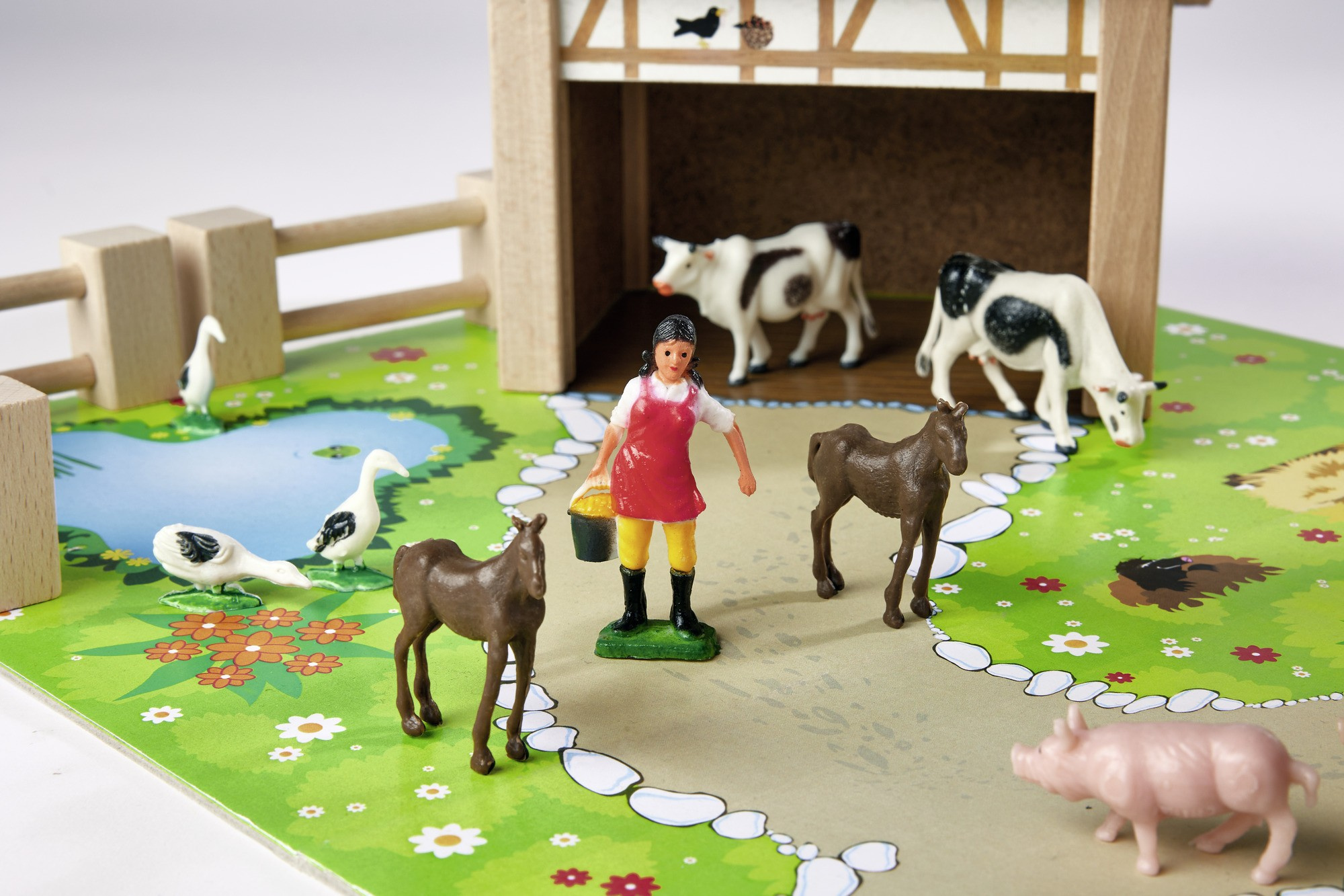 - w zestawie znajduje się 25 elementów: dom farmerski połączony z oborą, stajnia, kolorowe podłoże, ogrodzenia, naklejki oraz 12 figurek