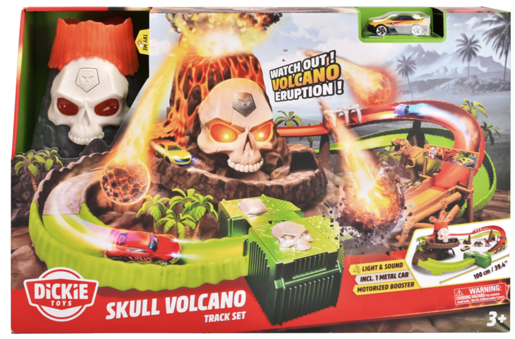 - W zestawie znajduje się tor samochodowy wraz z metalowym samochodem i akcesoriami. Wulkan posiada efekt erupcji. Tor wyposażony w efekty świetlne i dźwiękowe. Wymagane baterie: 4xAA oraz 2xAAA. Wymiary opakowania: 57,5 x 13,5 x 37,5 cm.
