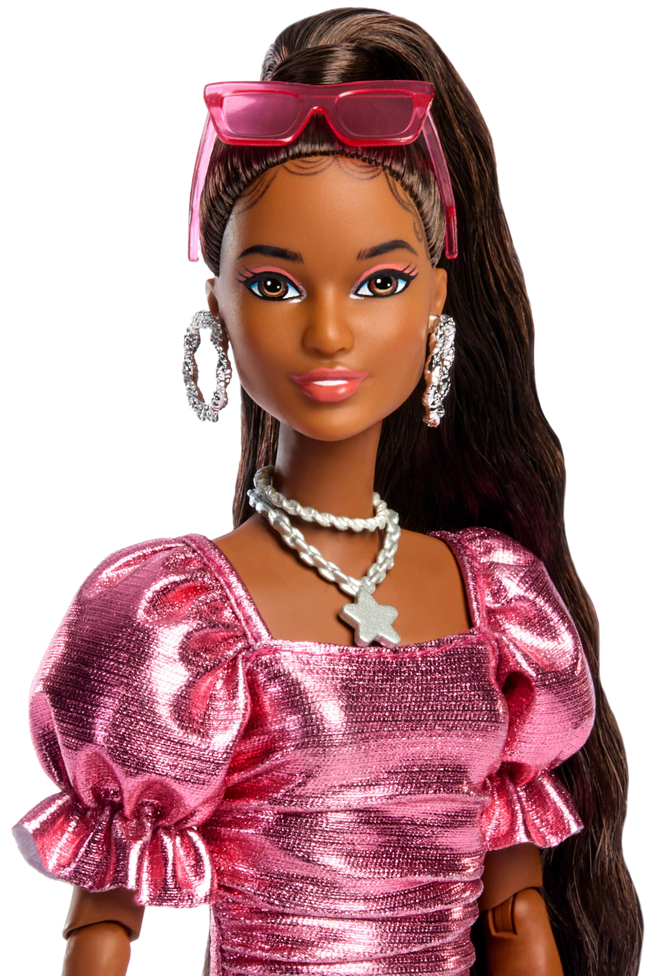Barbie prezentuje się zjawiskowo w koralowej, metalicznej sukience z obszernym dołem, która przyciąga wzrok swoim blaskiem i modnym krojem. Jej szczupła sylwetka i falowane czarne włosy upięte w wysoką kitkę nadają całości eleganckiego, ale jednocześnie odważnego charakteru. Stylizację dopełniają kolczyki w kształcie kół, naszyjnik z gwiazdką, różowe okulary przeciwsłoneczne, torebka z ozdobnymi „koralikami” oraz srebrzyste buty na obcasie, które idealnie komponują się z jej połyskującą kreacją.
