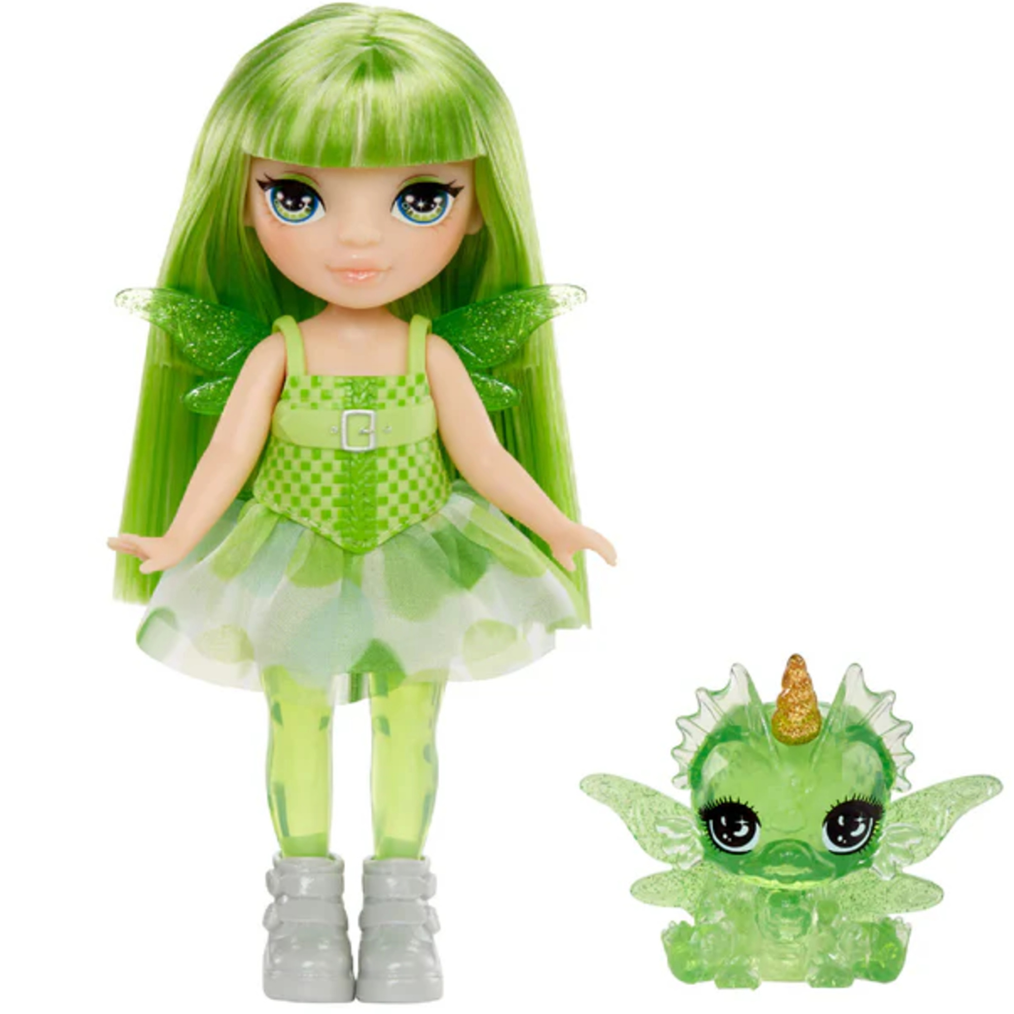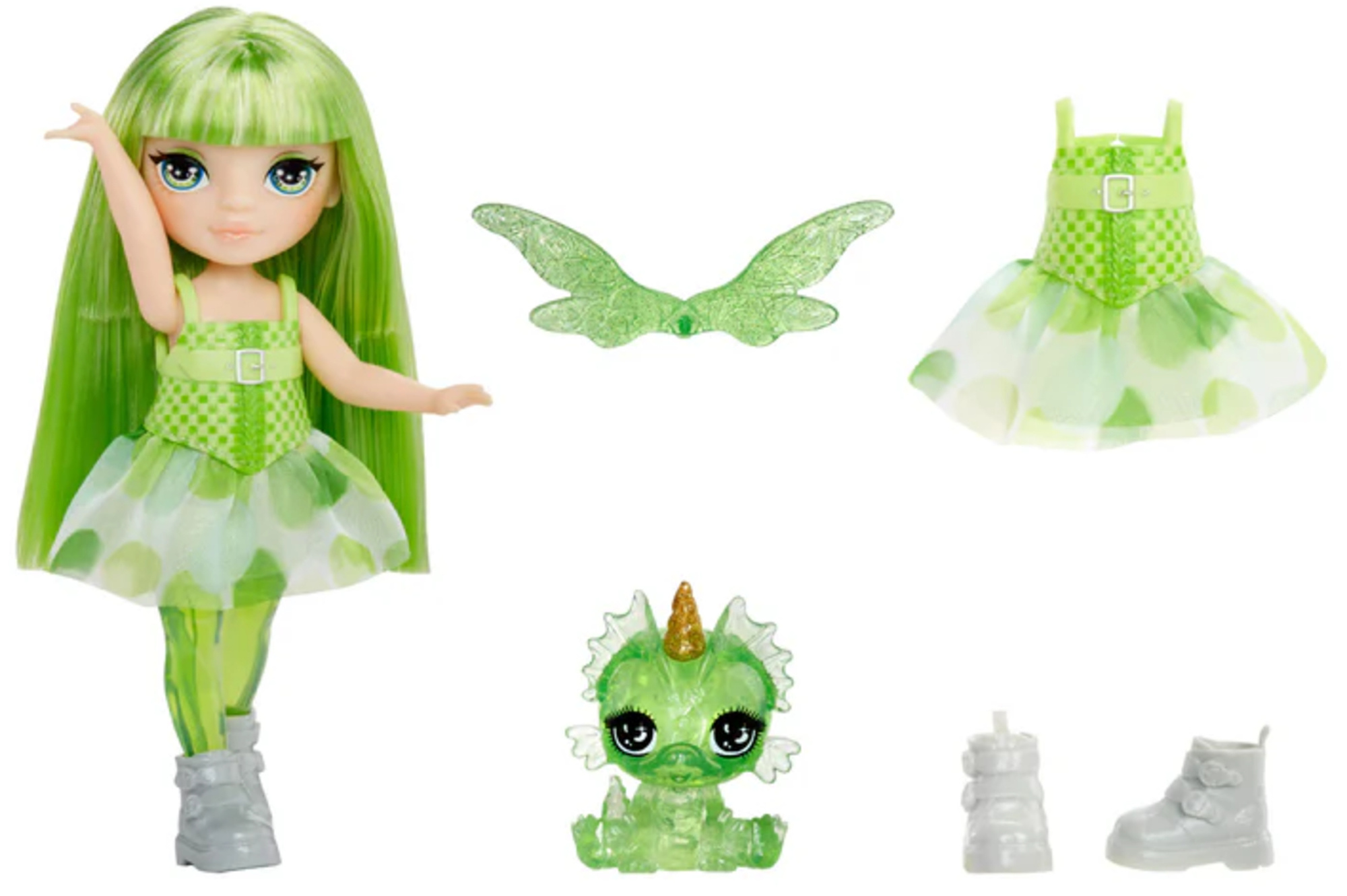 Zestawpochodzi z kolekcjiRainbow High Littles - Rainbow Fantasy Fairies, która zachwyca niepowtarzalnym stylem i urokiem inspirowanym magią wróżek i fantastycznych stworzeń. Taok. 15-centymetrowa lalka, stworzona z myślą o kreatywnej zabawie, prezentuje piękne rysy twarzy, długie, proste zielone włosy oraz przegubowe elementy głowy, ramion i nóg, co umożliwia swobodne pozowanie i odgrywanie scenek. Lalka mazdejmowany strój, stylowe buty, uczesane włosy oraz przezroczyste, kolorowe nogi, które podkreślają jej magiczny charakter.