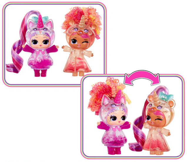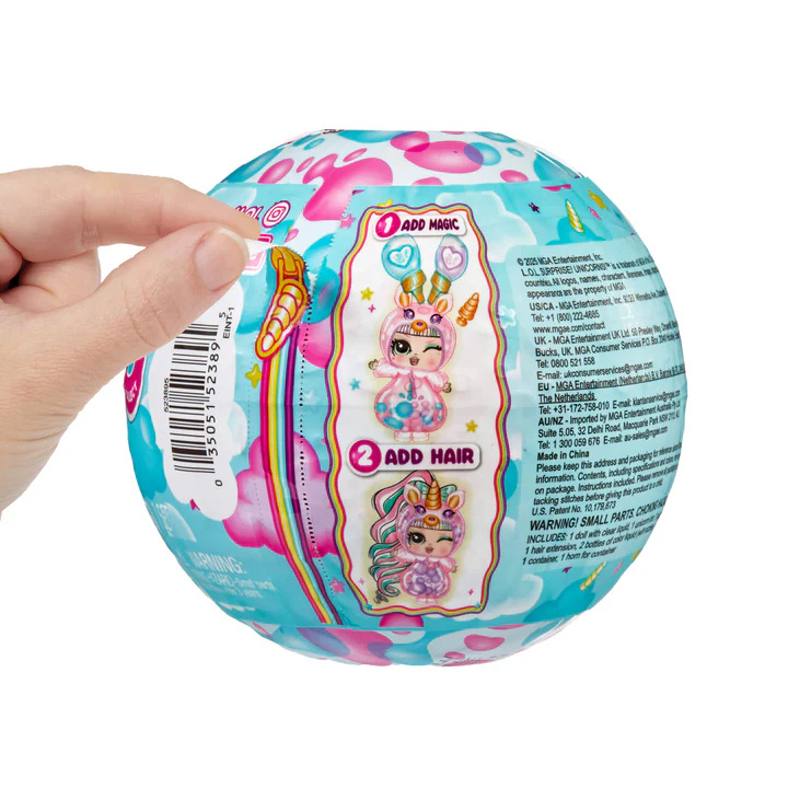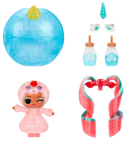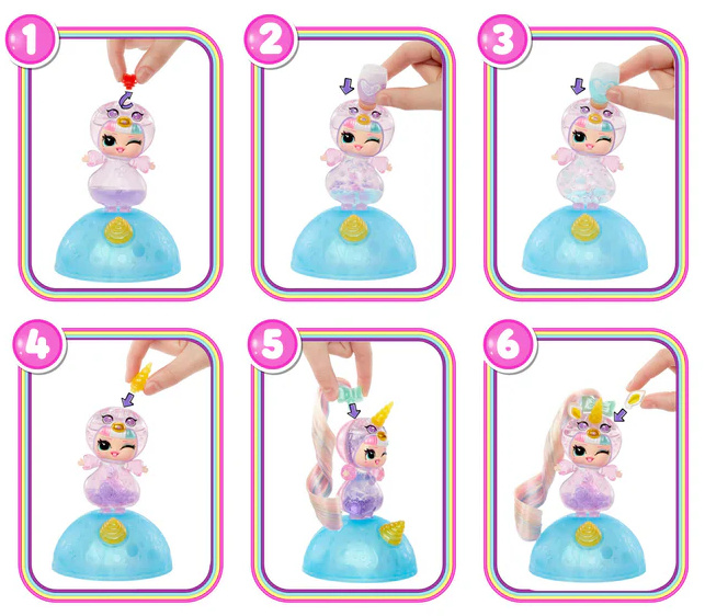 Po otwarciu kuli znajdziesz przezroczystą laleczkę Tot, kolorowe „mikstury”, akcesoria jednorożca i prawdziwe włosy do stylizacji! Umieść laleczkę na podstawce, użyj dołączonego lejka i kroplomierzy w kształcie serduszek, a następnie wlej kolorowe płyny do środka. Zatkaj otwór rogiem jednorożca i odwróć laleczkę, by zobaczyć, jak barwne mikstury magicznie przesuwają się w jej wnętrzu!
