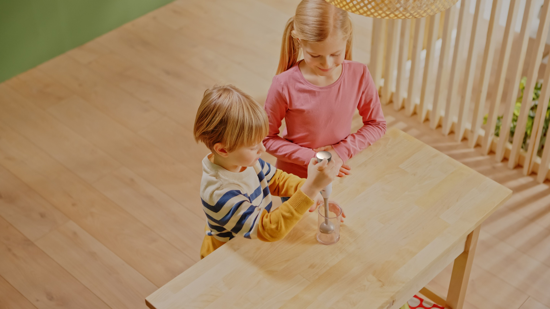 Końcówka blendera naprawdę się obraca po naciśnięciu guzika, a nasadkę mieszającą można zdjąć, co jeszcze bardziej urealnia zabawę. W zestawie znajduje się także przezroczysty pojemnik z miarką (250 ml), w którym dziecko może „przygotowywać” swoje kulinarne eksperymenty.
