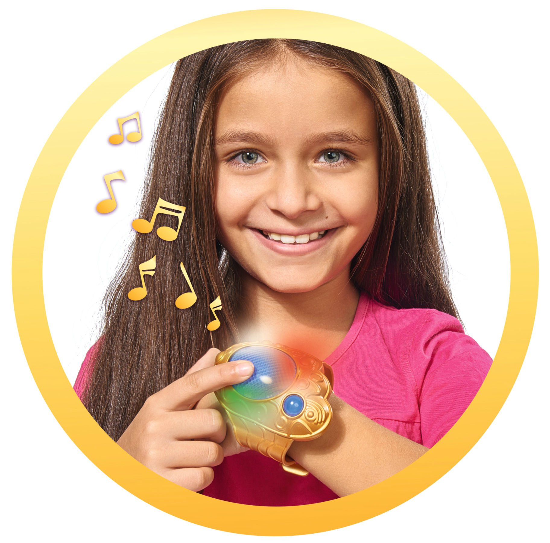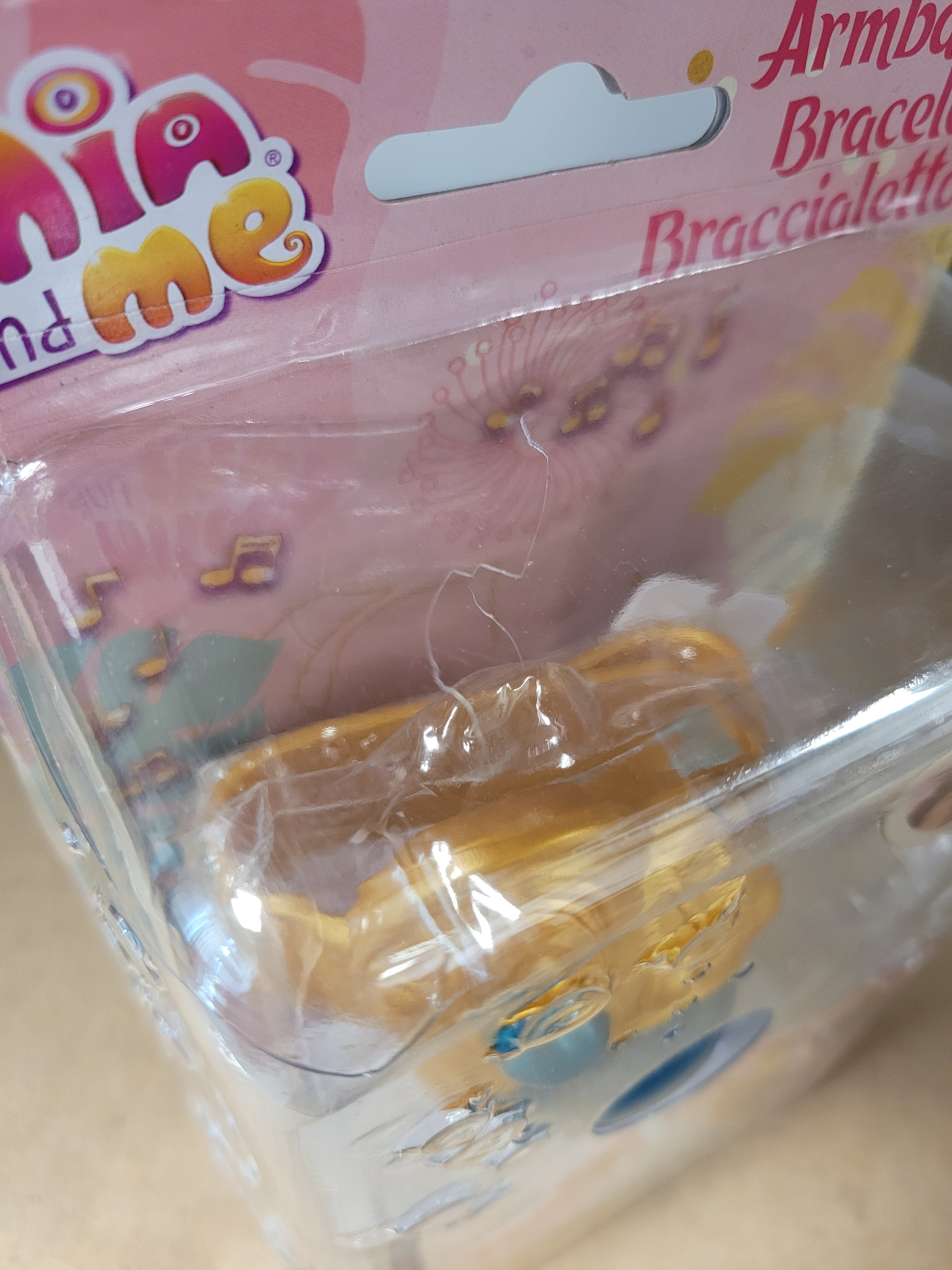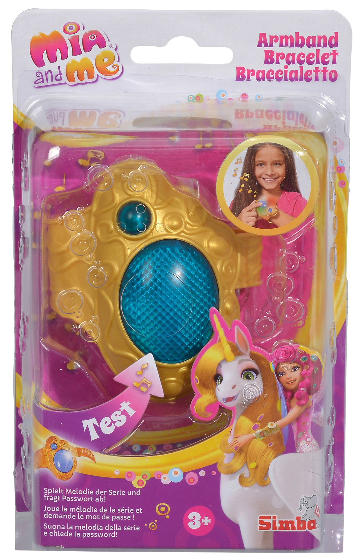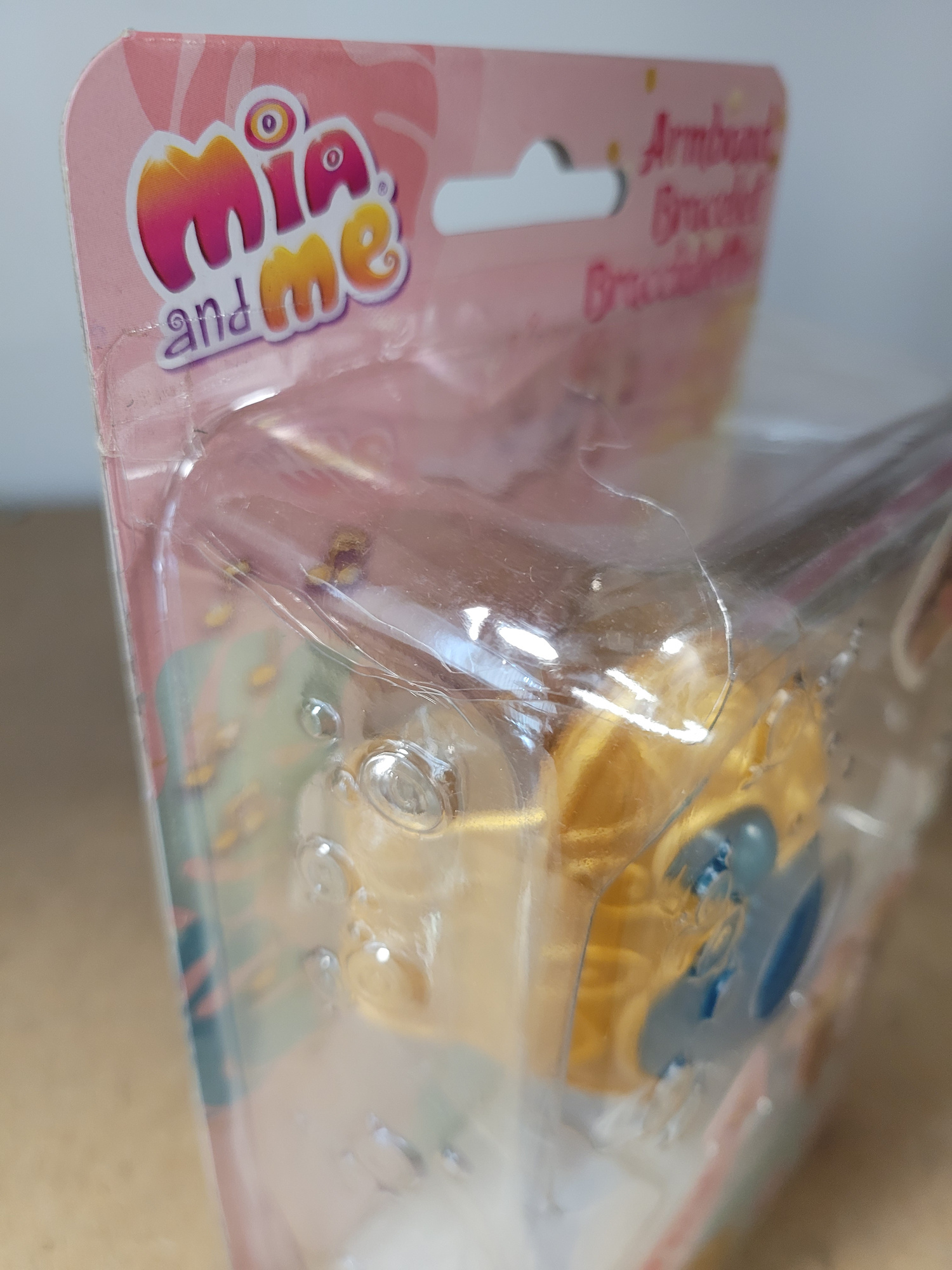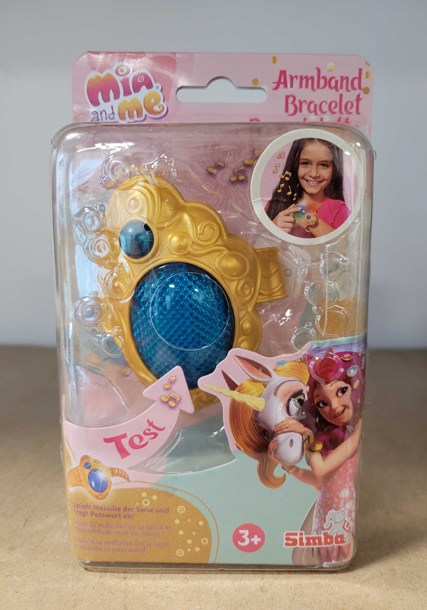 - Bransoletka w kolorze złotym z niebieską lampką, która po naciśnięciu świeci różnymi kolorami i wydaje przeróżne dźwięki w tym wygrywa piosenkę pochodzącą z bajki Mia i Ja.