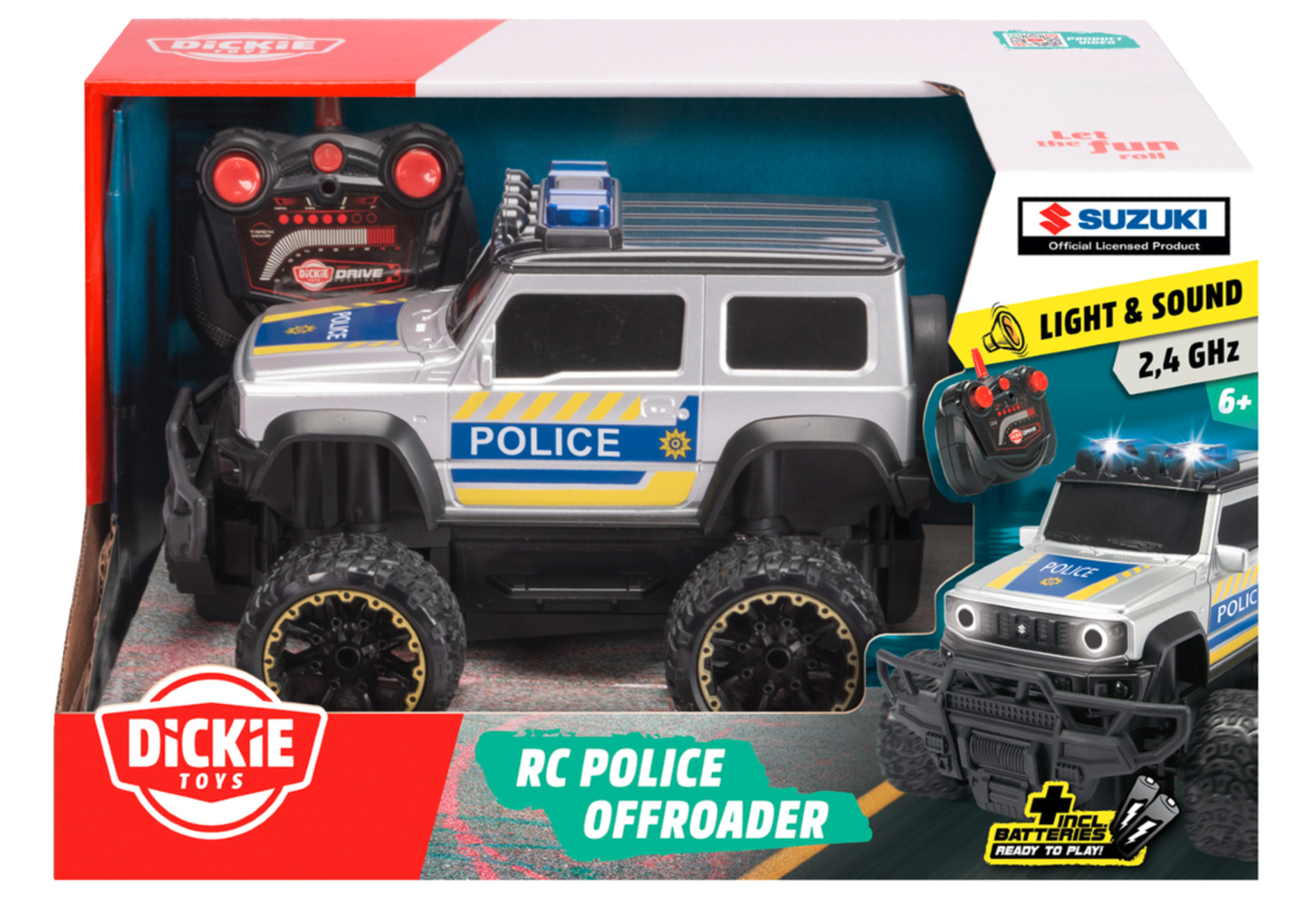- Samochód policyjny RC marki Dickie to idealna zabawka dla małych fanów akcji i motoryzacji. Model powstał na licencji Suzuki. Dzięki pilotowi, dziecko może z łatwością prowadzić w dowolnym kierunku. Dodatkową atrakcją są efekty świetlne i dźwiękowe