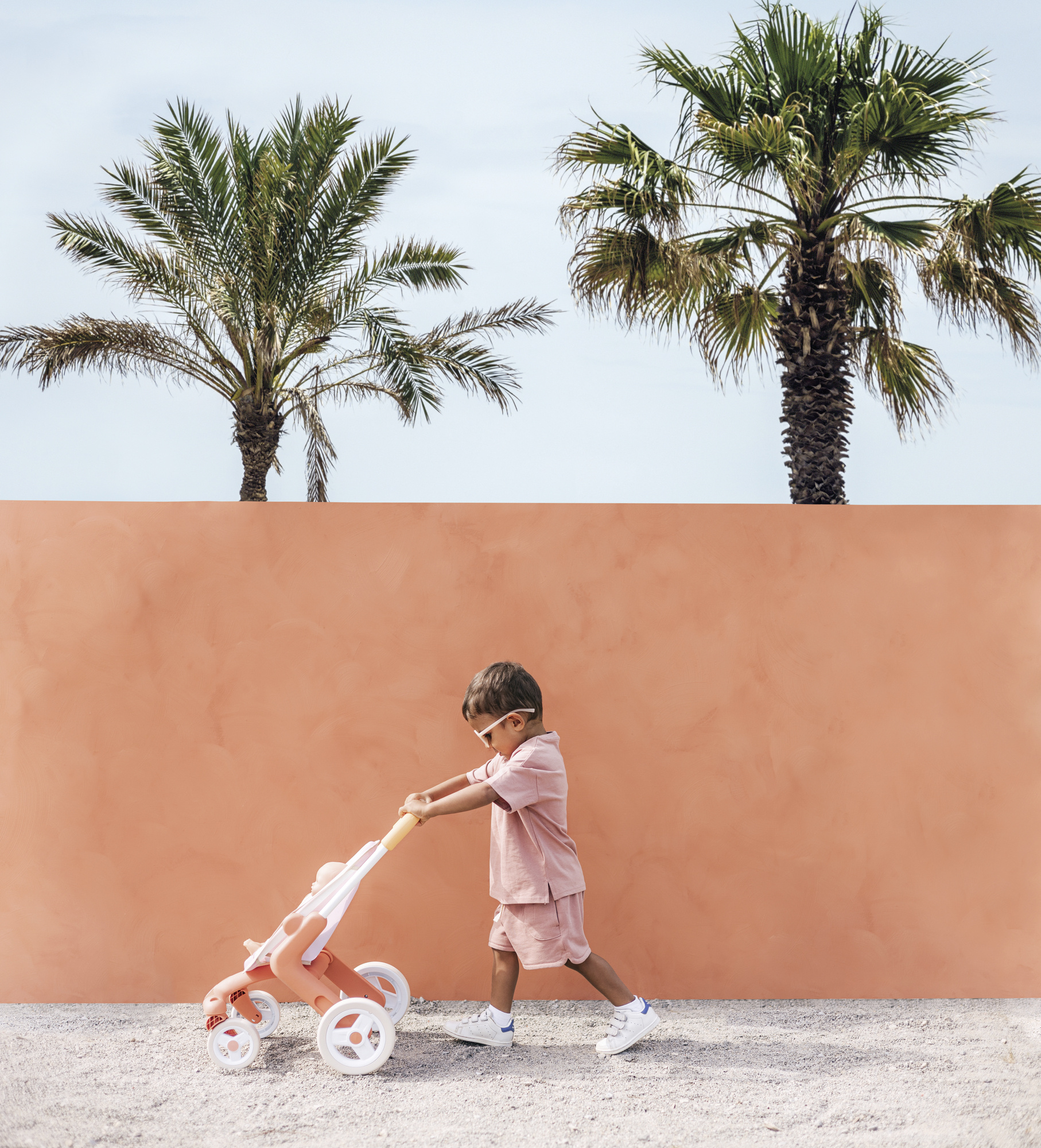 Wózek jest w stonowanych kolorach: biało-pomarańczowa rama, jasnoróżowe siedzisko. Posiada stalową ramę oraz wygodną rączkę, dzięki czemu nadaje się do zabawy dla dzieci powyżej 18 miesiąca życia. Materiał jest miękki w dotyku i łatwy w czyszczeniu.