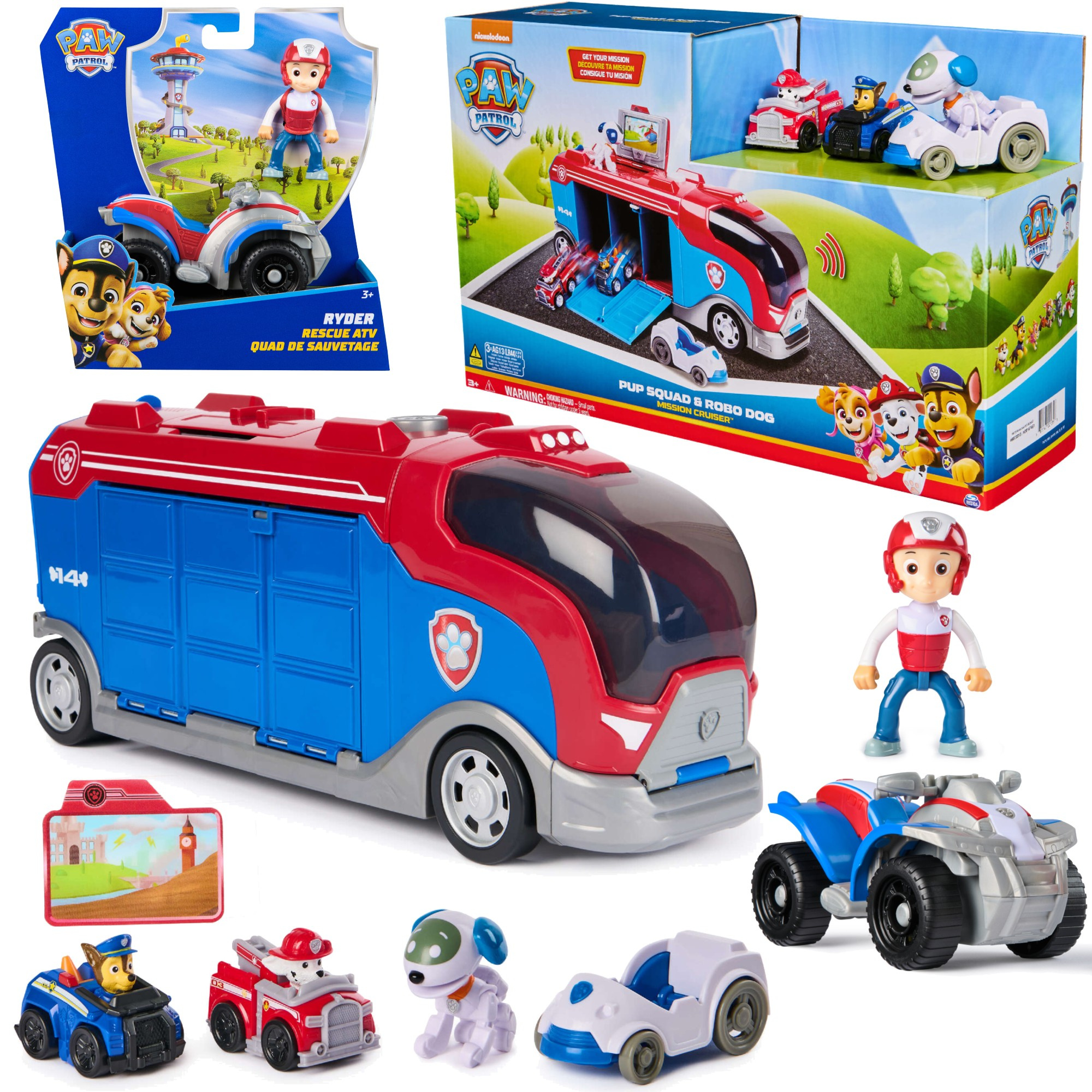 - Mission Cruiser: Duży pojazd z drzwiami otwieranymi za pomocą sprężyny, monitorem misji i miejscem parkingowym dla wszystkich piesków z Psiego Patrolu.