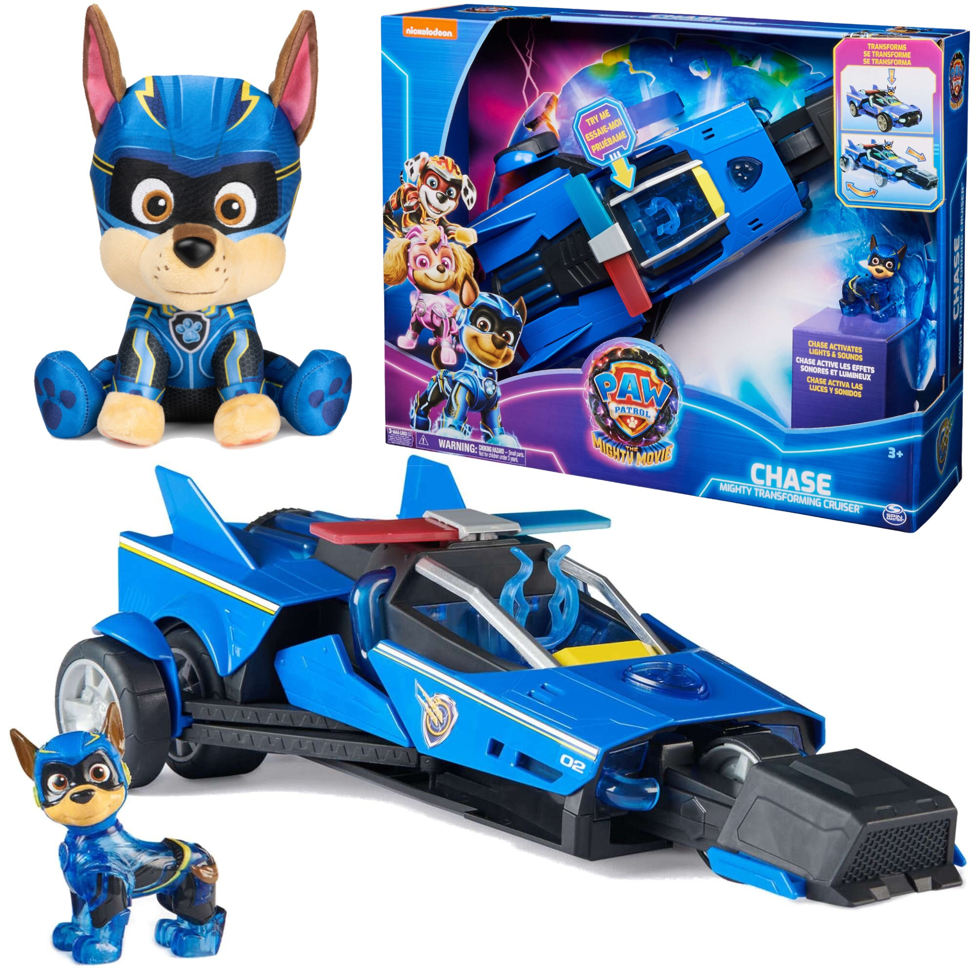 Zestaw Psi Patrol The Mighty Movie Wielki Film Figurka Chase Niebieski pojazd wóz policyjny Interaktywne autko Deluxe światło dźwięk + maskotka Chase 23 cm