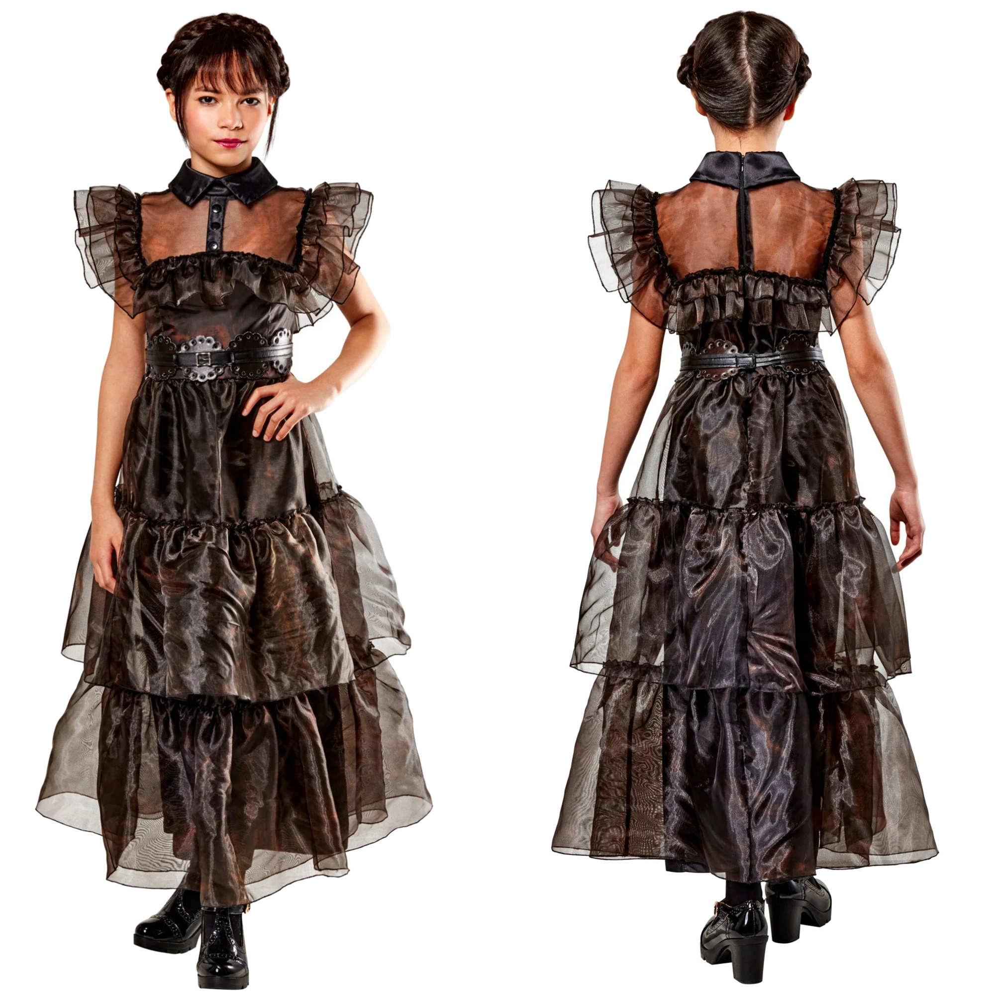 - Oficjalnie licencjonowany strój pozwoli każdemu dziecku wcielić się w Wednesday Addams podczas jej słynnego tańca ze szkolnego balu. W zestawie znajduje się czarna sukienka z ozdobnym paskiem, zapinana z tyłu na zamek błyskawiczny.