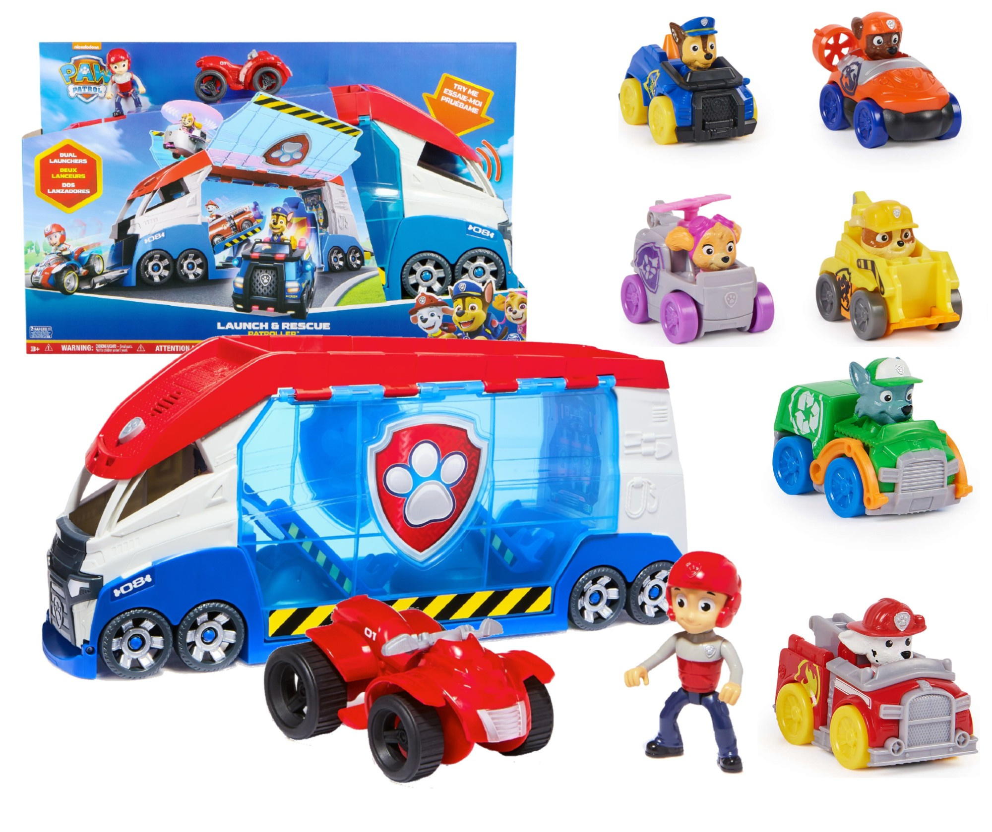 Ogromny Patrolowiec Launch and Rescue z efektami dźwiękowymi, ruchomą figurką Rydera i jego quadem, a do tego 6 pojazdów z bohaterami serialu – Chase, Marshall, Skye, Rocky, Rubble i Zuma!