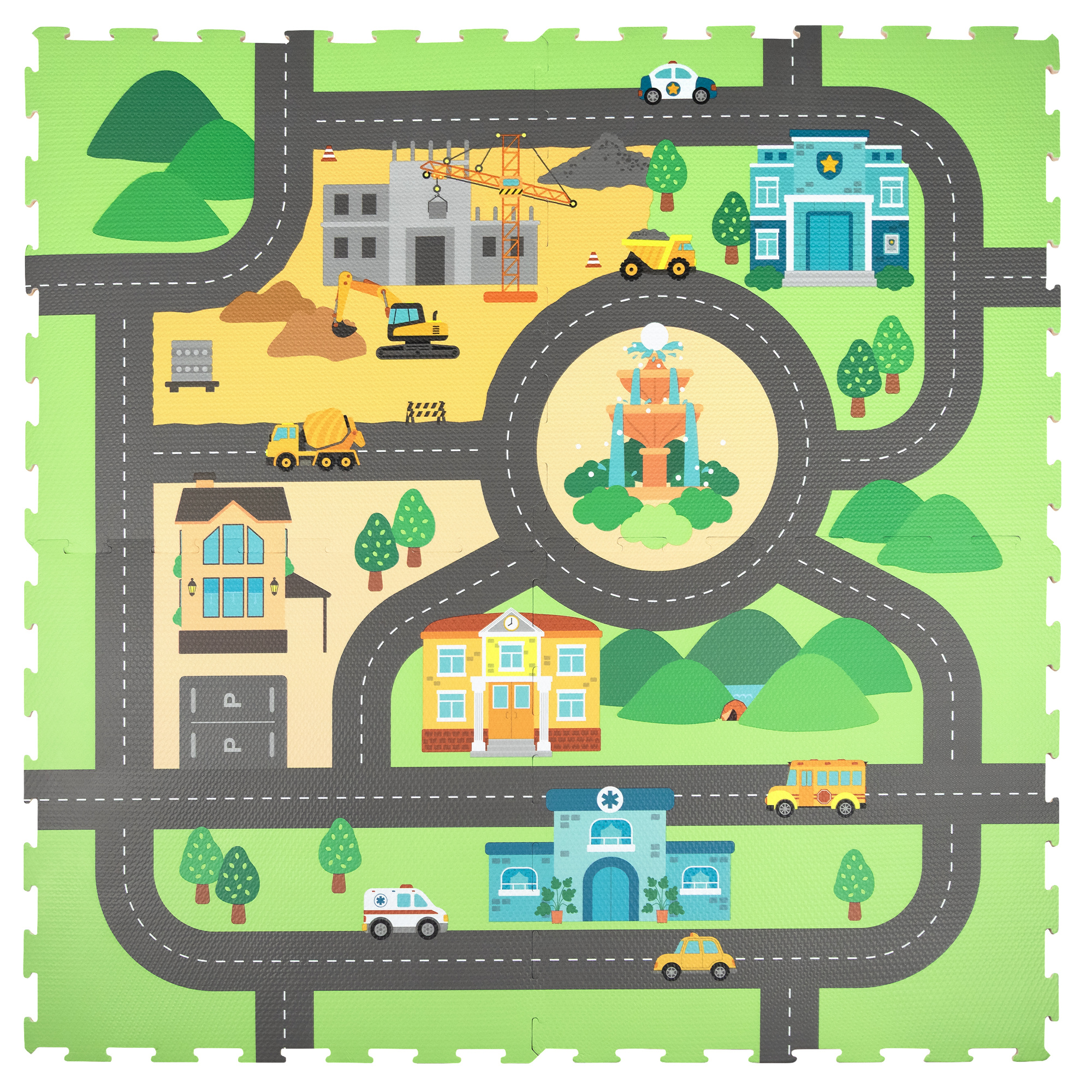 - W zestawie znajduje się: 4 kolorowe puzzle, instrukcja. Najważniejsze funkcje zestawu: Mata Podłogowa, Nadrukowane Miasto. Wymiary maty po rozłożeniu: ok. 120 x 0,8 x 120 cm. Wymiary pojedynczego puzzla: 60 x 0,8 x 60 cm