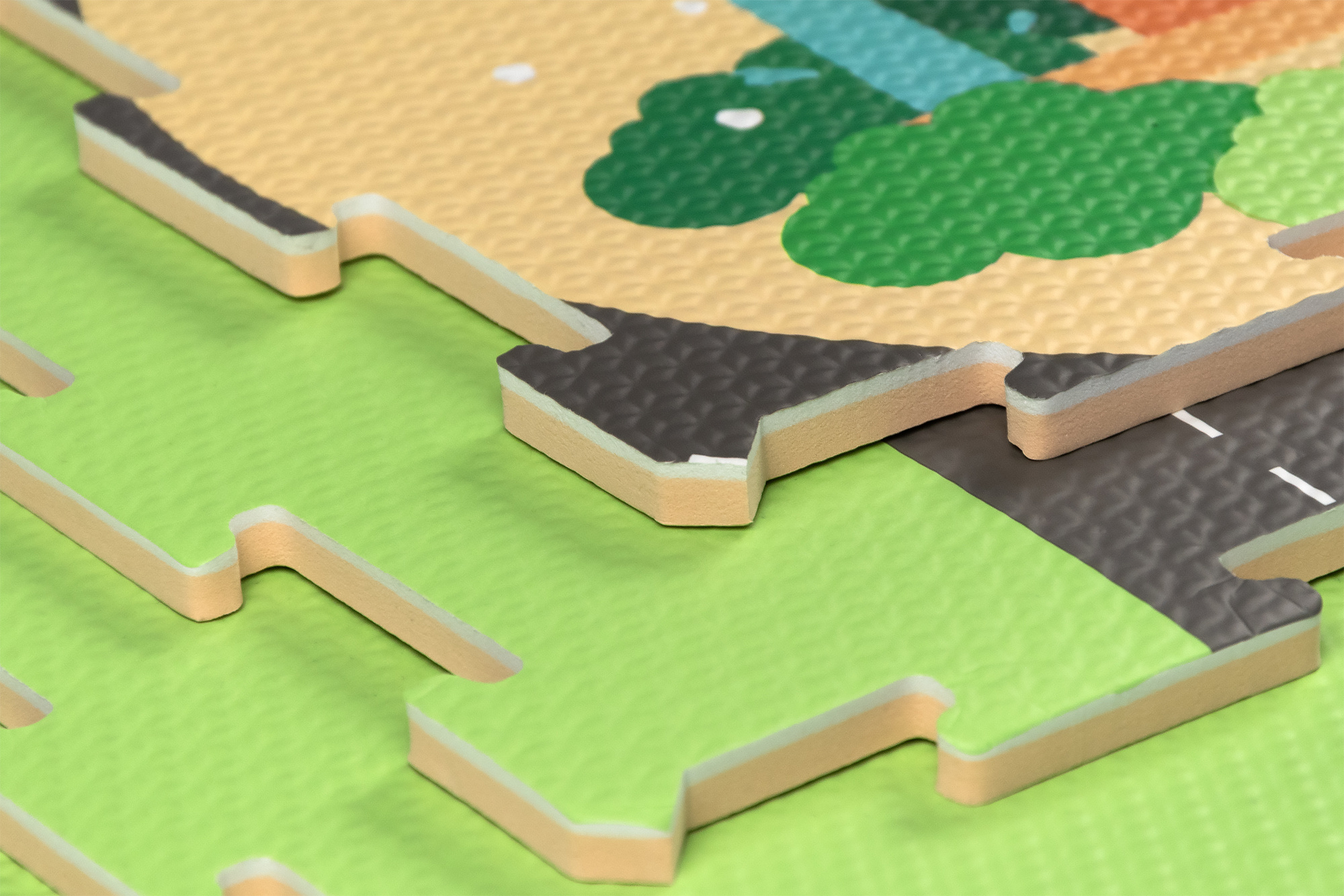 Łącznie w zestawie znajdują się 4 elementy. Każdy element maty zostały stworzone z elastycznej i trwałej pianki EVA. Wysokiej jakości pianka jest całkowicie bezpieczna - bez ftalanów, formamidu, BPA ani PVC. Natomiast miękka powierzchnia oraz antypoślizgowa powłoka amortyzują upadki i chronią dziecięce ciało przed zimną podłogą.