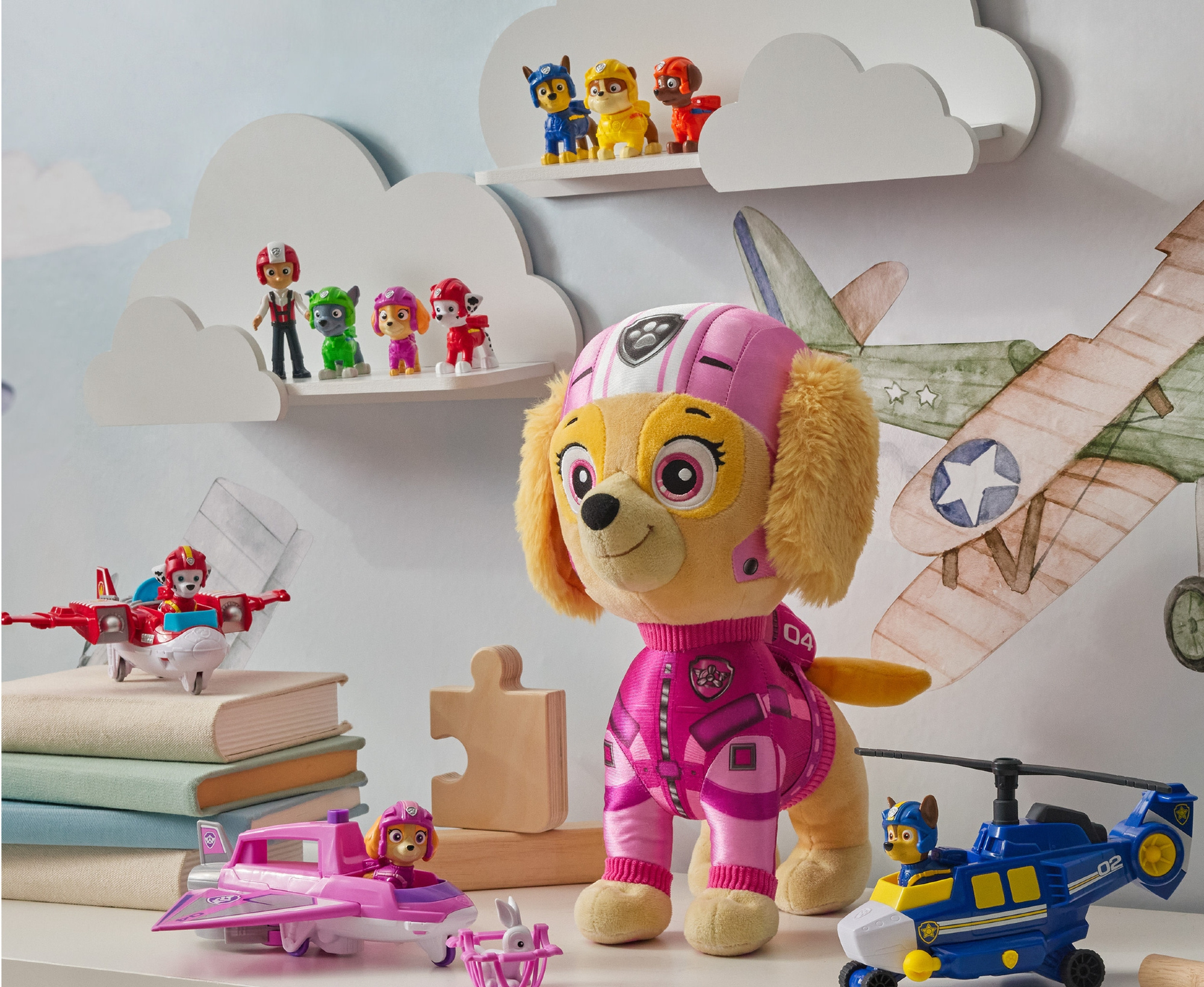 • Figurka Skye i samolot Hero Claw Jet – Skye w różowym kombinezonie lotniczym i kasku może pilotować samolot, a wysuwany chwytak i kosz ratunkowy umożliwiają „ratowanie” króliczka.