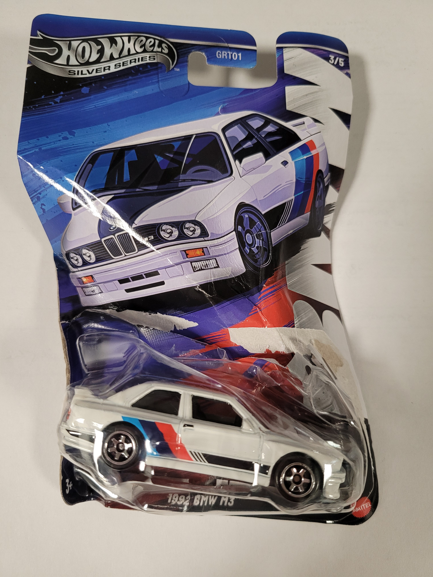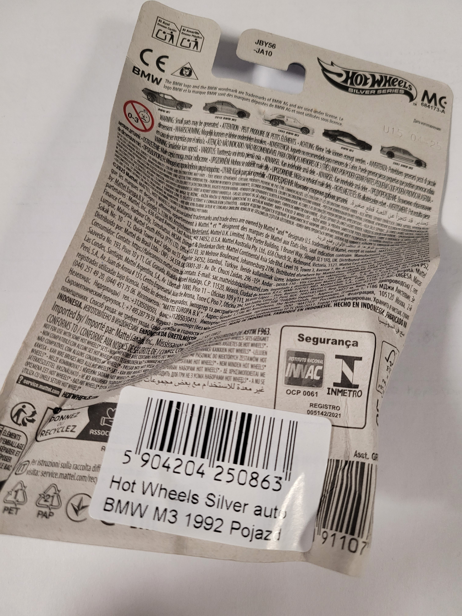 OUTLET Hot Wheels Silver auto BMW M3 1992 Pojazd Osobowy Biały Samochód USZKODZONE OPAKOWANIE