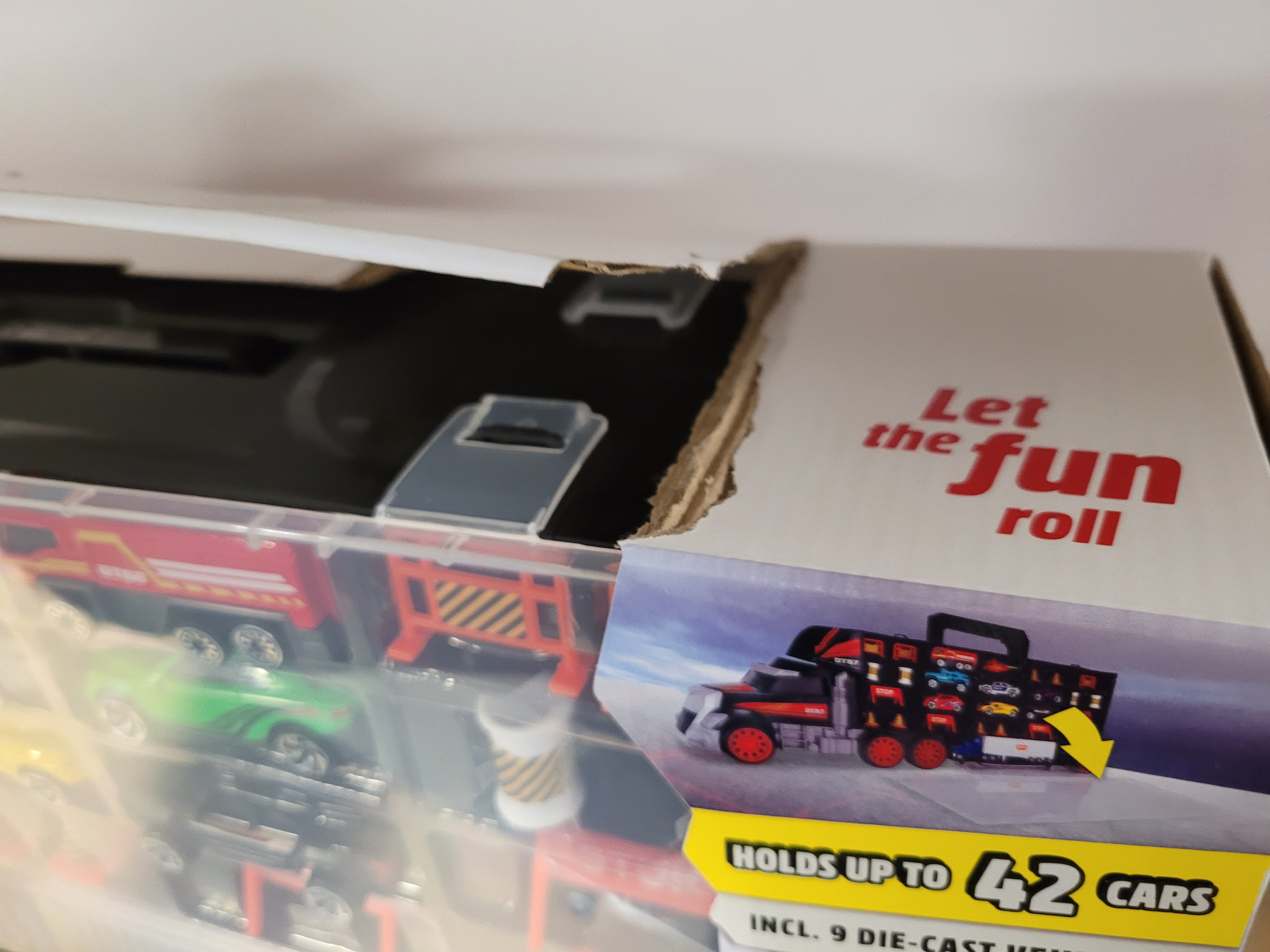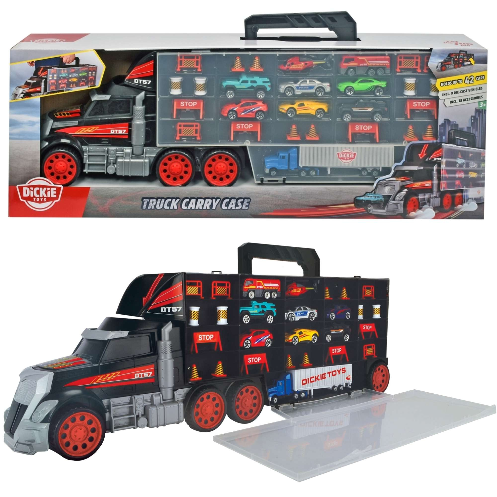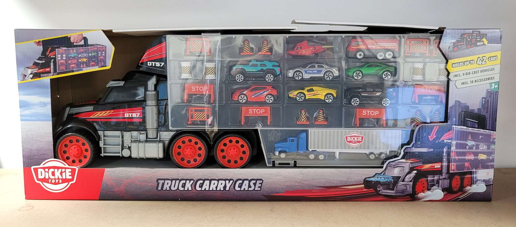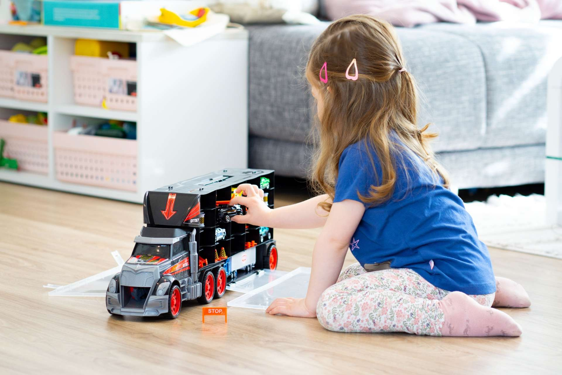 Ciężarówka, to niezwykły pomysł na prezent dla każdego małego miłośnika motoryzacji. Transporter jest w kolorze czarnym z czerwonymi i szarymi elementami, posiada ruchome koła, umożliwiające mu poruszanie się po powierzchniach płaskich i system otwierania bocznego, który ułatwia wkładanie i wyciąganie aut. W transporterze można przechowywać aż 42 samochodziki, a same przegródki są rewelacyjnie dostosowane do potrzeb. Jego długość to ok. 63 cm. W zestawie znajduje się 18 akcesoriów, takich jak helikopter, samochód ciężarowy, autka i akcesoria drogowe.