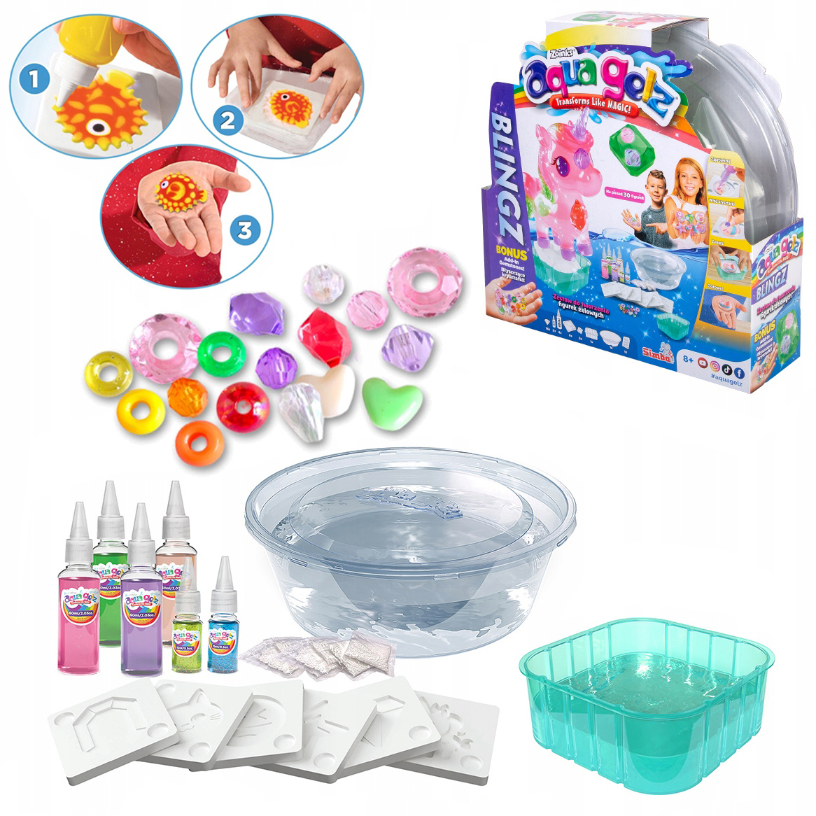 Aqua Gelz to zabawa kreatywna dla ciekawych, chcących rozwijać dziecięce pasje. Polega ona na tworzeniu miękkich stworków 3D przy pomocy mieszanki magicznego roztworu i kolorowego żelu.