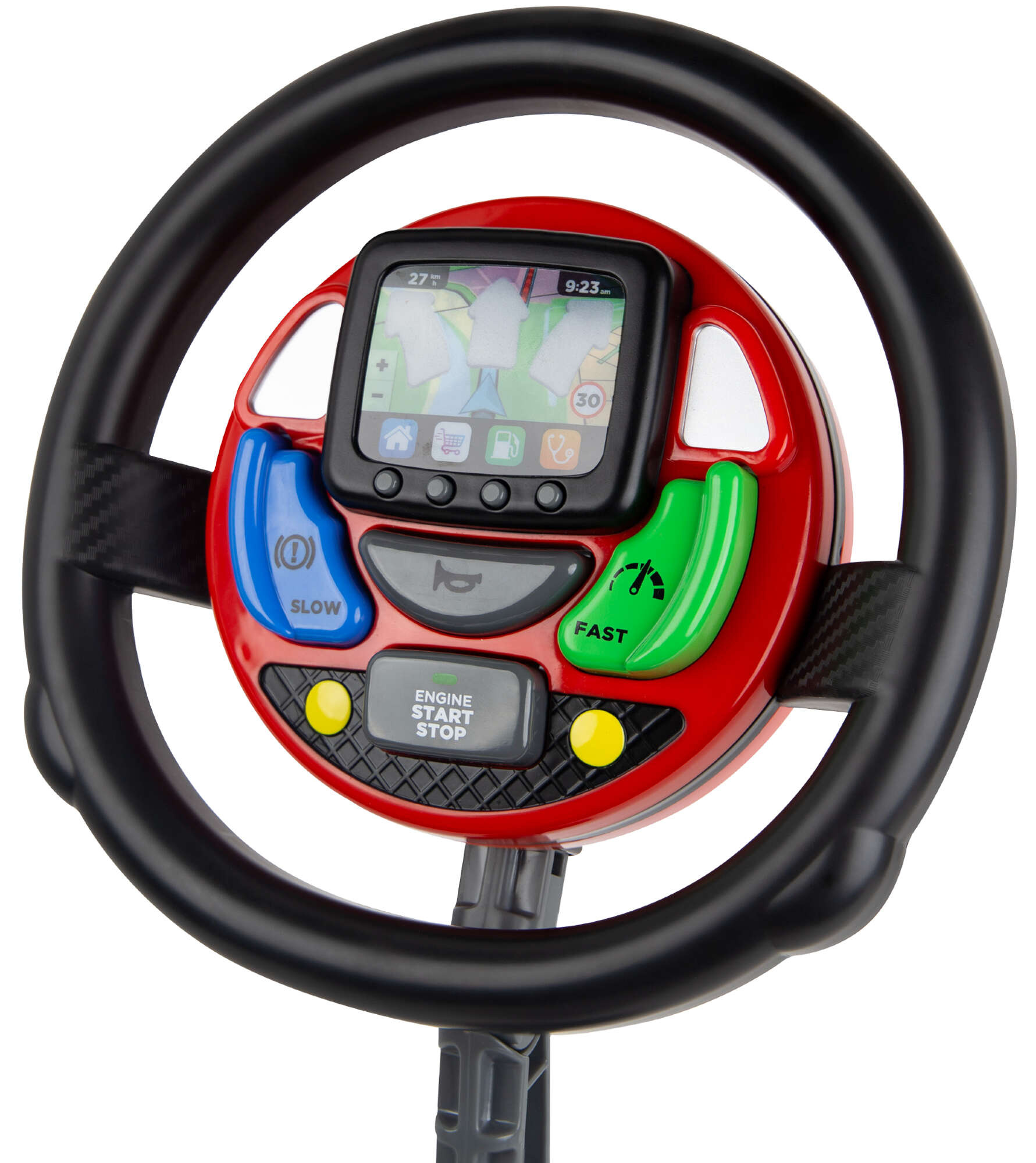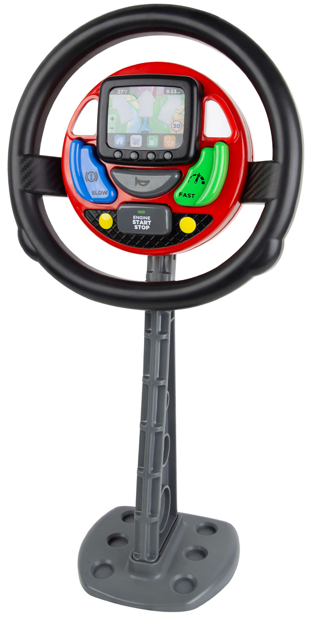 Kierownica ta posiada szarą, stabilną podstawkę (kierownica odczepiana od podstawki), dzięki której zabawa nią jest bardzo wygodna. Interaktywny panel kierownicy jest w kolorze czerwonym i został wyposażony w: