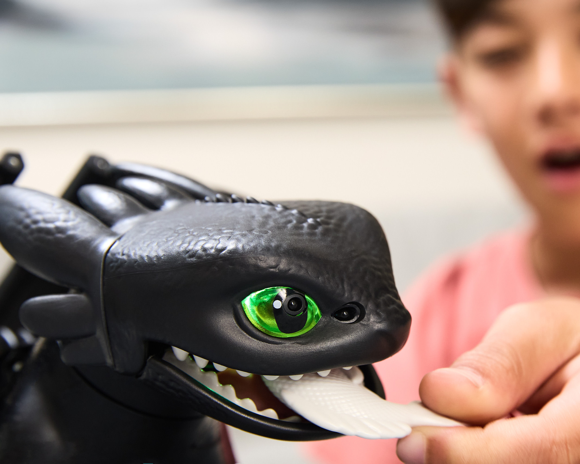 Otwórz opakowanie w formie „klatki” i powitaj swojego własnego, dzikiego smoka Nocnej Furii. Twoim zadaniem jest zdobycie jego zaufania - pomóż mu się oswoić, karmiąc go ulubioną rybką (dołączoną do zestawu). Szczerbatek reaguje na ruchy, śledząc rybkę i dłoń, a z czasem zmienia swoje zachowanie - od nieufnego po przyjaznego i oddanego towarzysza.