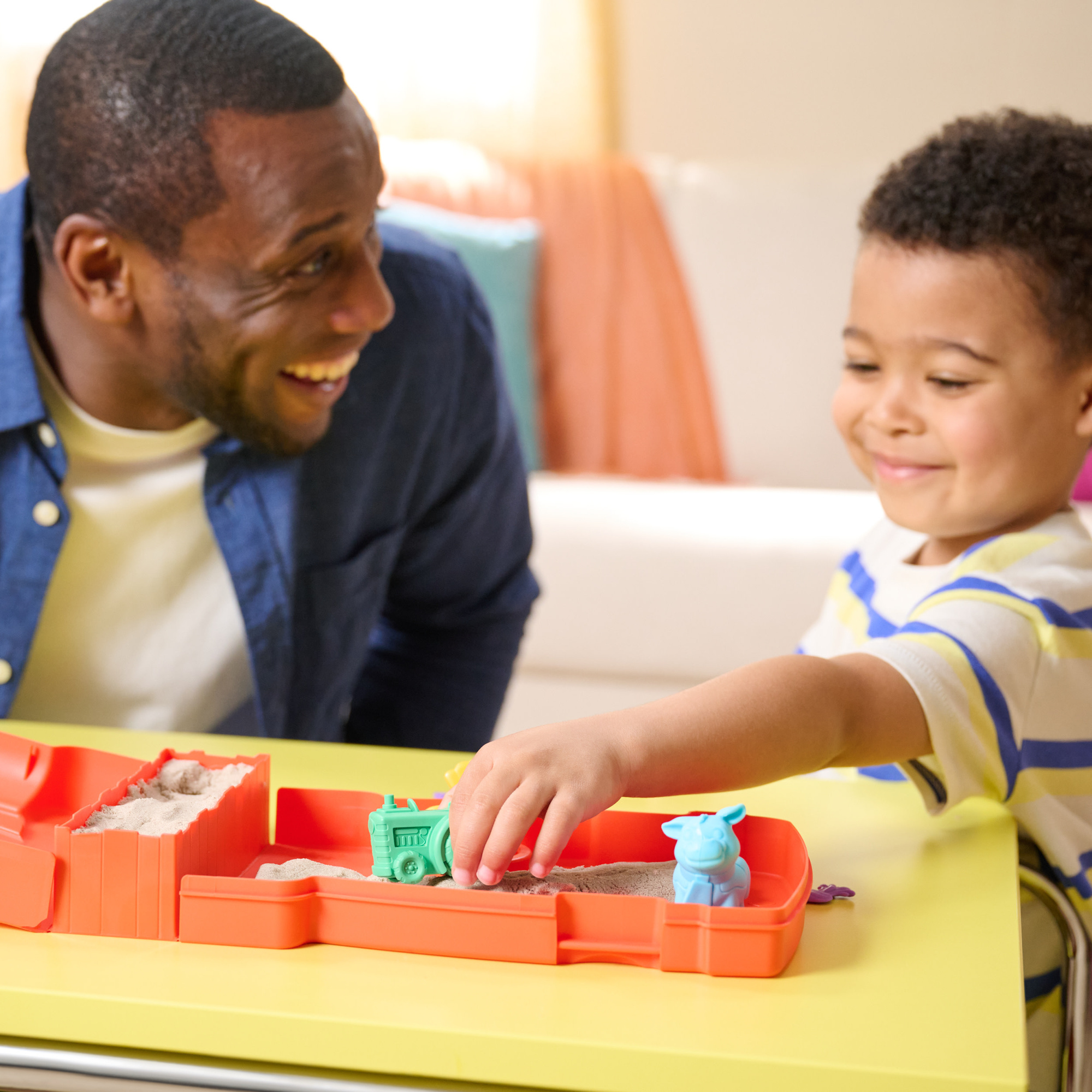 Całość zamknięta jest w pojemniku w kształcie pomarańczowej stodoły, która służy zarówno jako miejsce zabawy, jak i praktyczne pudełko do przechowywania. Po skończonej zabawie wystarczy schować piasek i akcesoria do środka, by zachować porządek do kolejnej przygody.