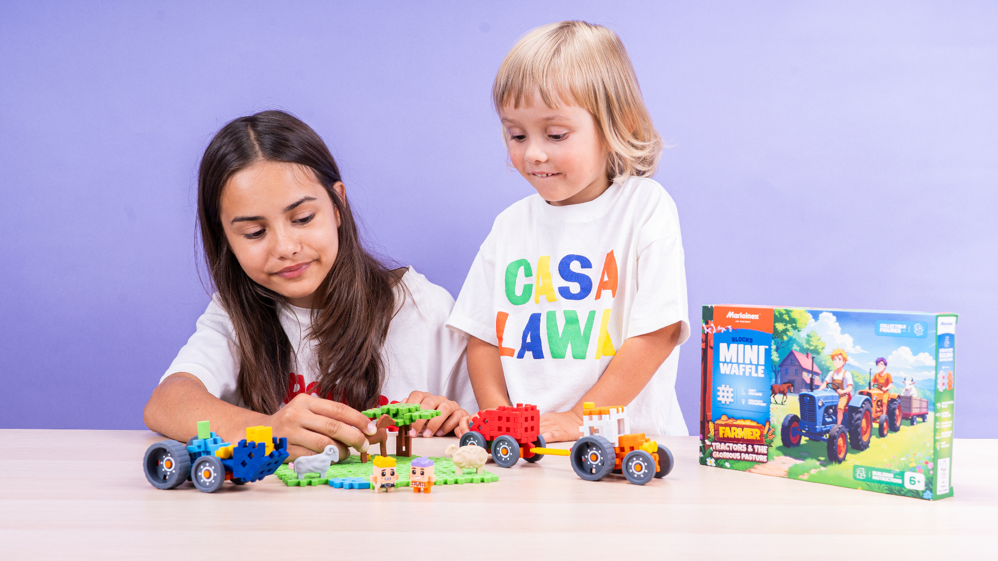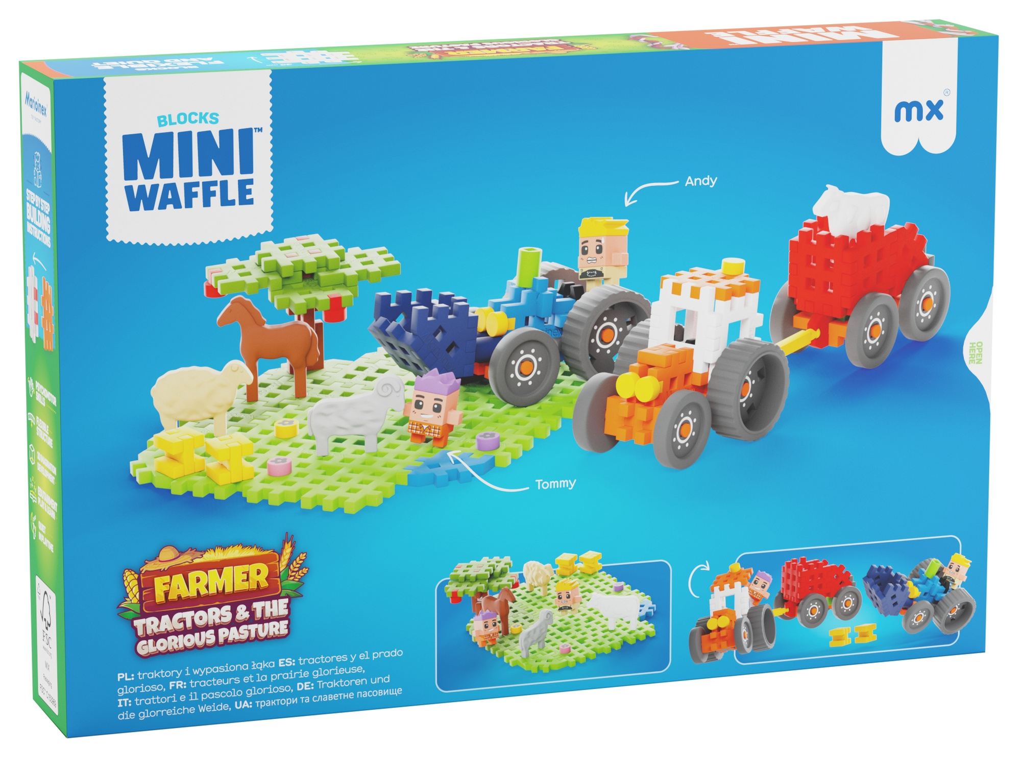 Marioinex Mini Waffle Farmer - Traktory i Wypasiona Łąka to połączenie świetnej zabawy i nauki przez działanie - idealny wybór dla małych konstruktorów i miłośników życia na farmie.