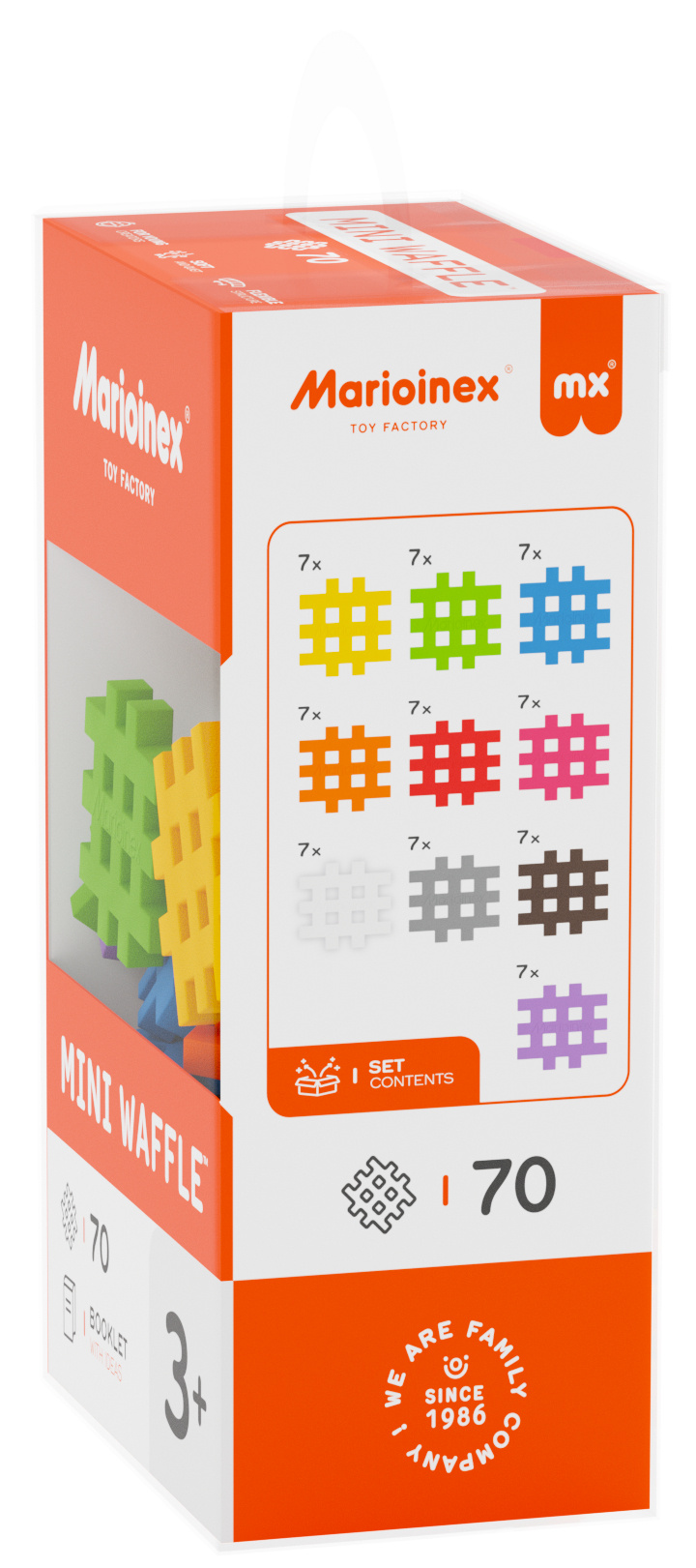 - Z zestawem Mini Waffle 70 dziecko może tworzyć wszystko, co tylko przyjdzie mu do głowy. Dołączona instrukcja stanowi inspirację do tworzenia pierwszych projektów, a elastyczne, miękkie elementy zachęcają do swobodnego konstruowania.