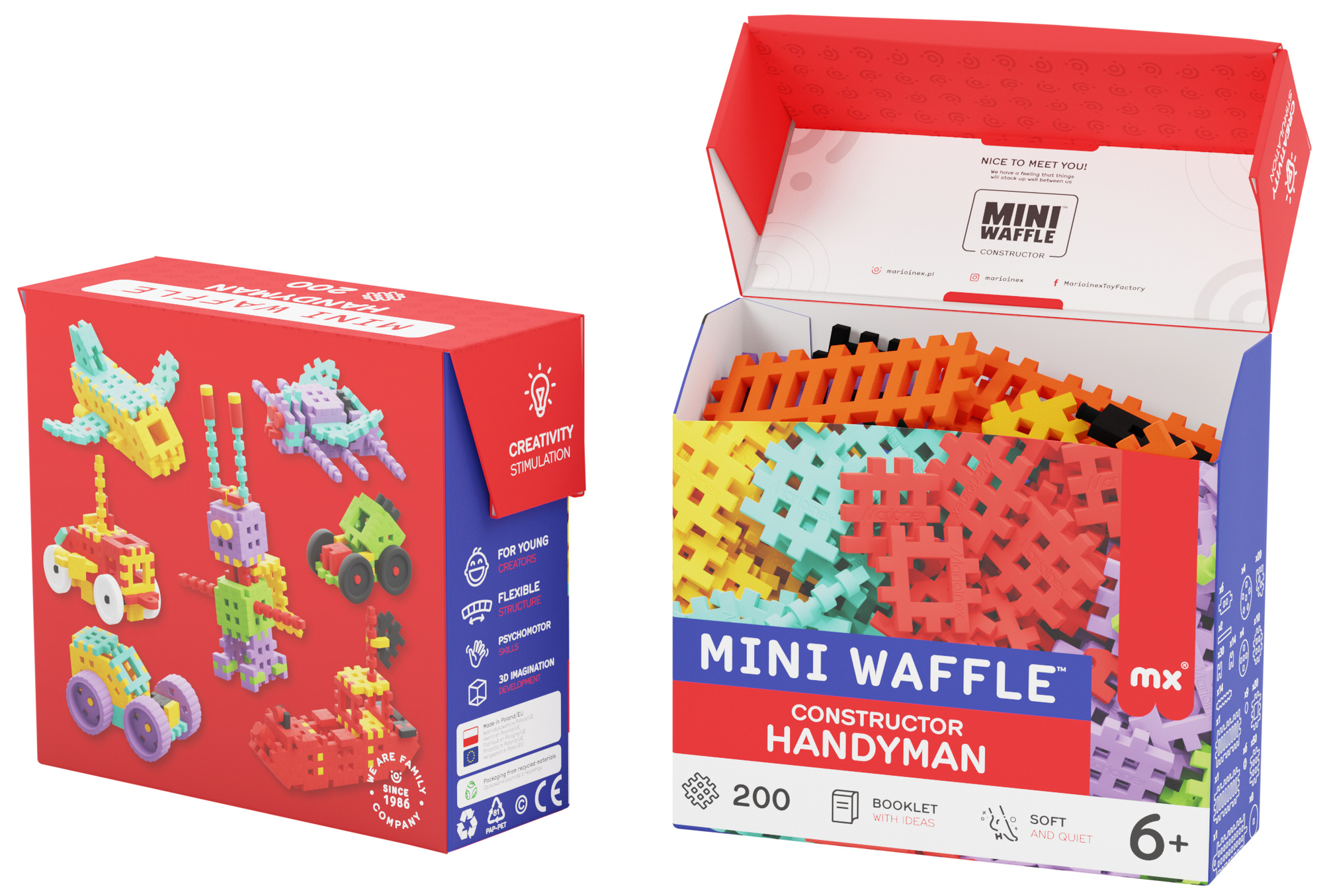 - Z zestawem Marioinex Mini Waffle Konstruktor Majster to aż 200 elastycznych, kolorowych klocków w 17 różnych kształtach dziecko może tworzyć wszystko, co tylko przyjdzie mu do głowy
