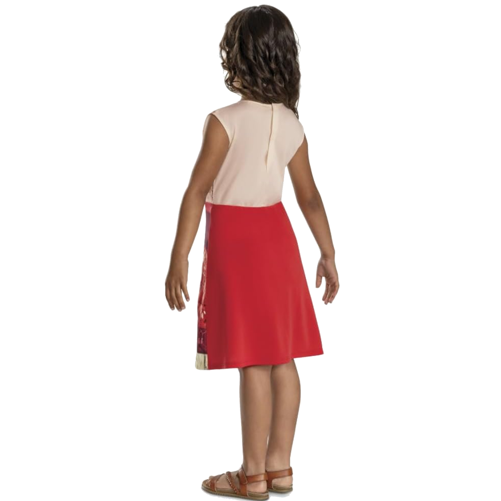 Zawiera czerwono - kremową sukienkę z krótkim rękawkiem, w ciekawy indiański wzór. Integralną częścią stroju jest doszyty, niebieski wisiorek. Dzięki całości stroju dziecko może upodobnić się do bohaterki bajki - Vaiany.