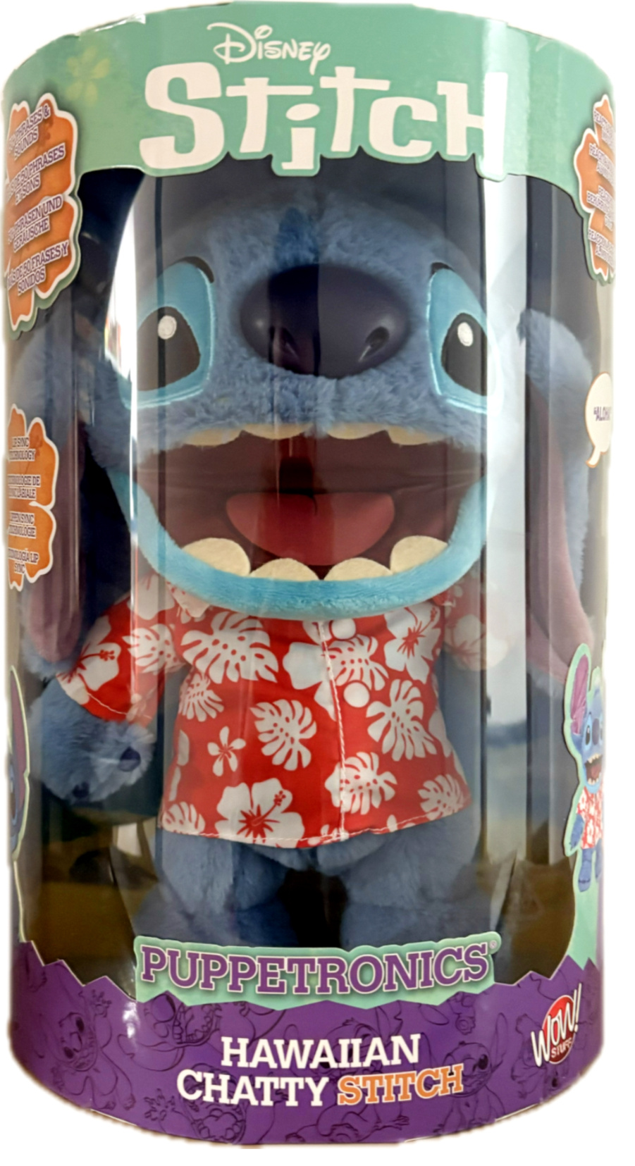 Hawaiian Chatty Stitch Puppetronics to edycja zabawki, która łączy w sobie cechy animatroniczne i interaktywne elementy kukiełki. Mierzy niemal ok 30 cm wysokości, co czyni ją idealną zarówno do przytulania, jak i do ekspozycji. Wykonana z wysokiej jakości, miękkiego pluszu, zachwyca wyjątkowym wyglądem inspirowanym postacią Stitcha.