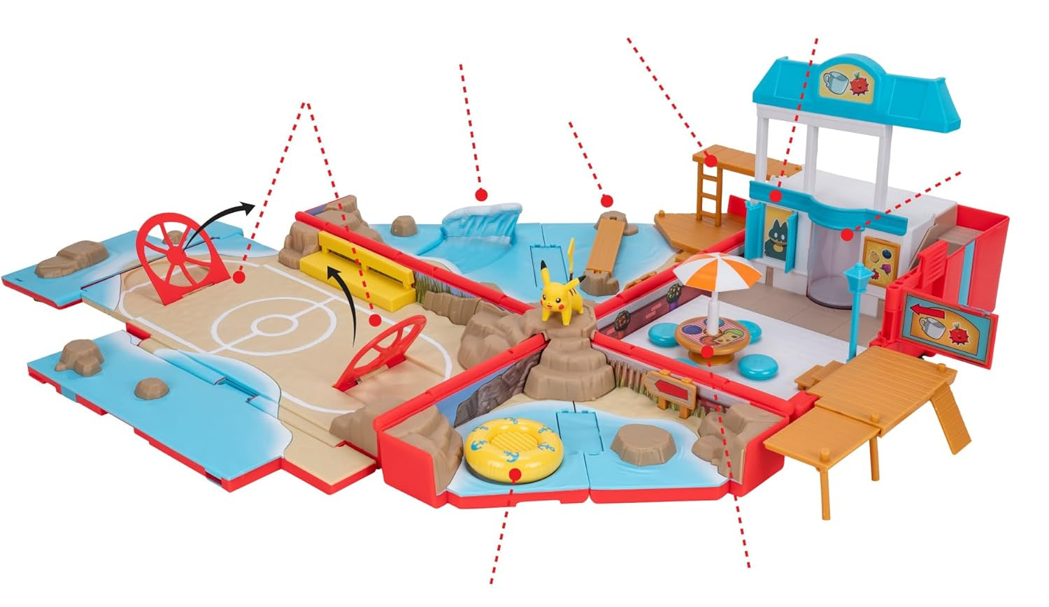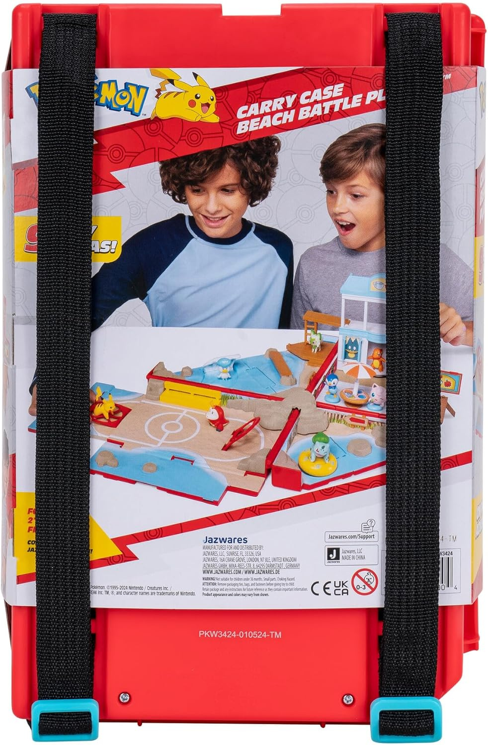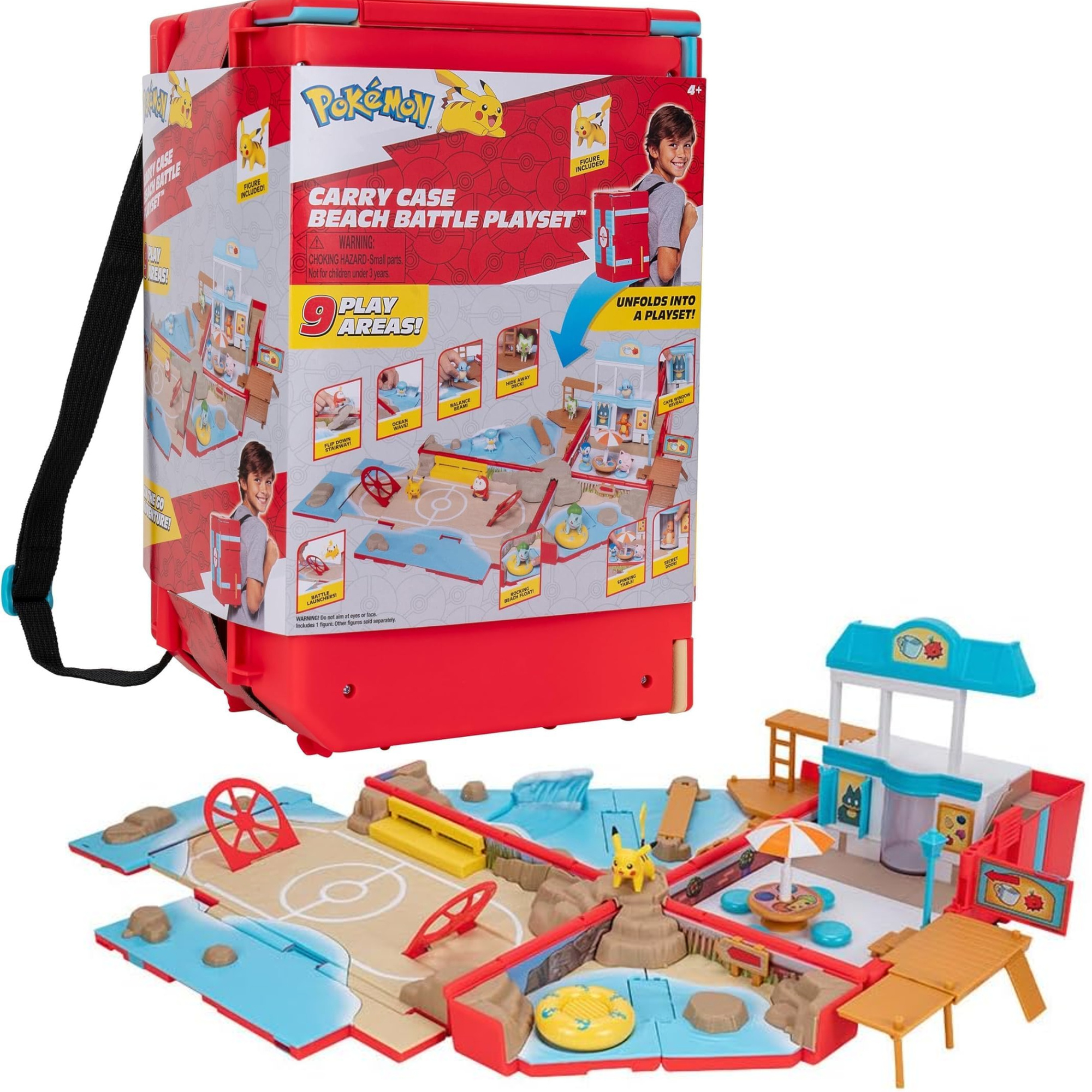 Przenośny zestaw Pokémon Beach Battle to kompaktowy plecak, który po rozłożeniu zmienia się w pełną scenerię plażowej przygody. To idealna propozycja dla dzieci lubiących kreatywną zabawę figurkami oraz fanów serii Pokémon.