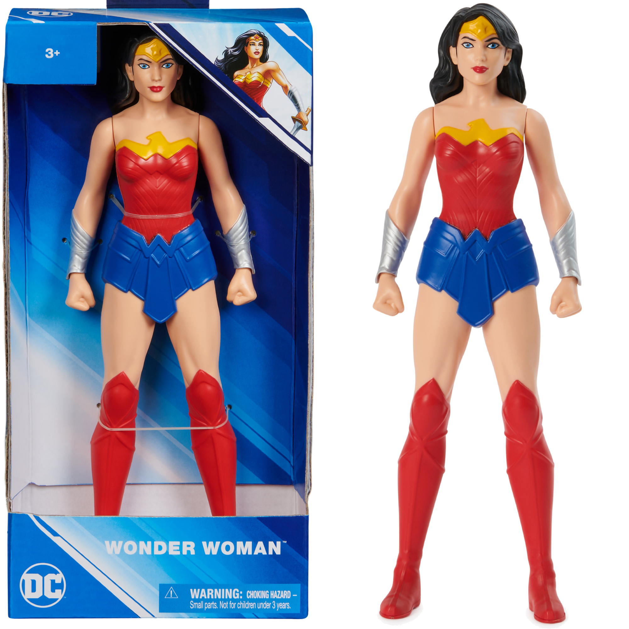 Figurka przedstawia postać Diany Prince - Wonder Woman w charakterystycznym czerwono-niebiesko-żółtym stroju i wysokich butach.