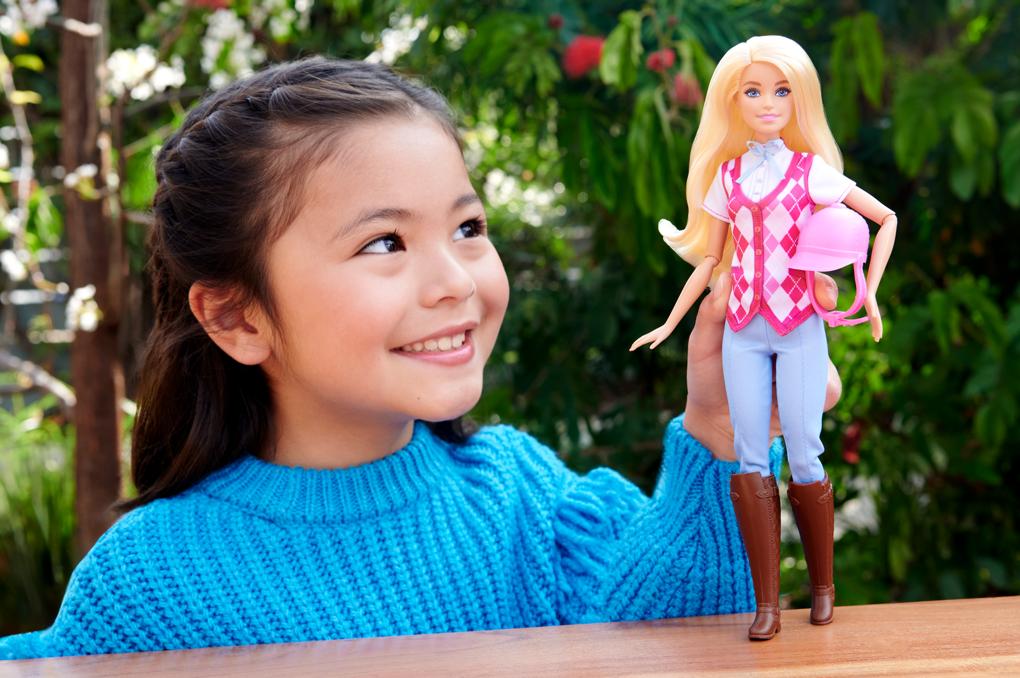 - lalka Barbie blondynka w stroju jeździeckim z hełmem dżokejka