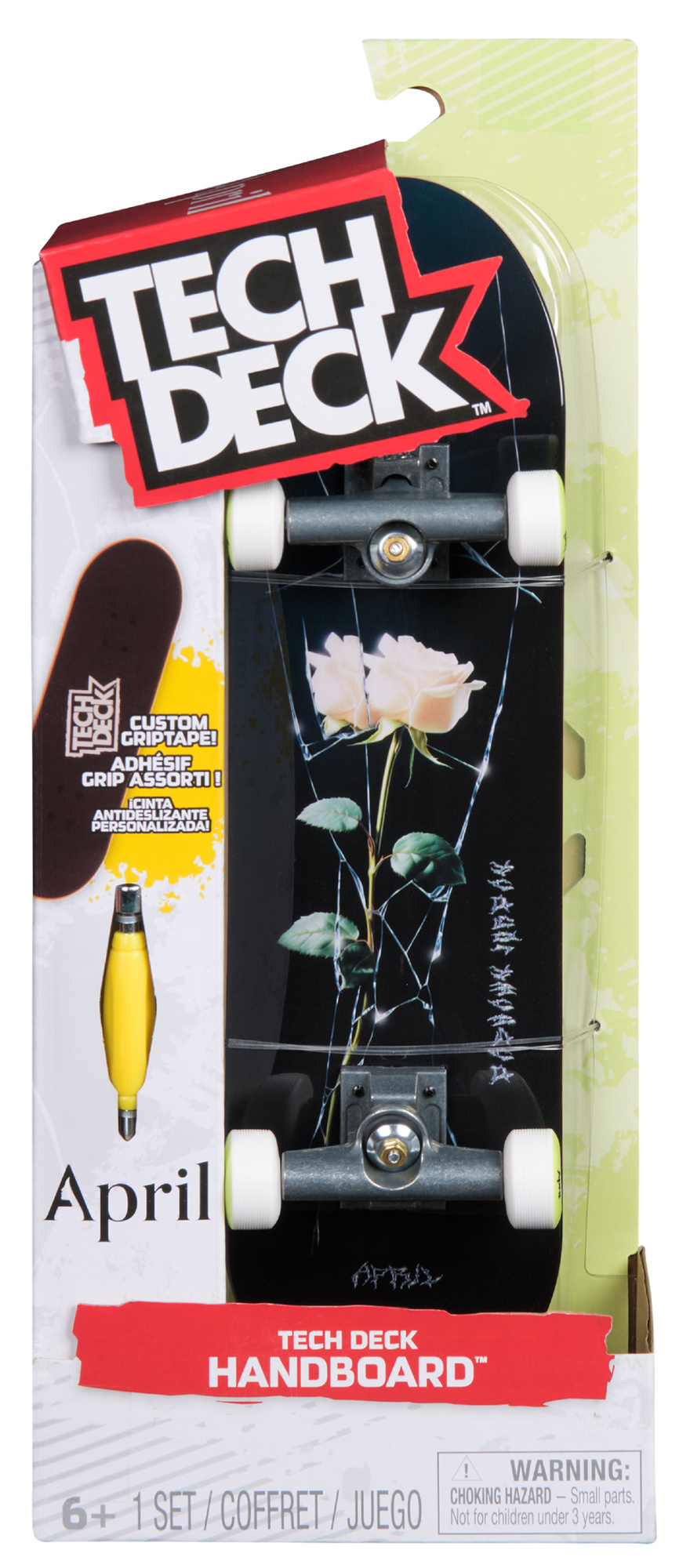 - Duża deskorolka handboard maxi April od Tech Deck. W opakowaniu znajduje się złożona deskorolka Tech Deck z ilustracją i 1 narzędzie do montażu.