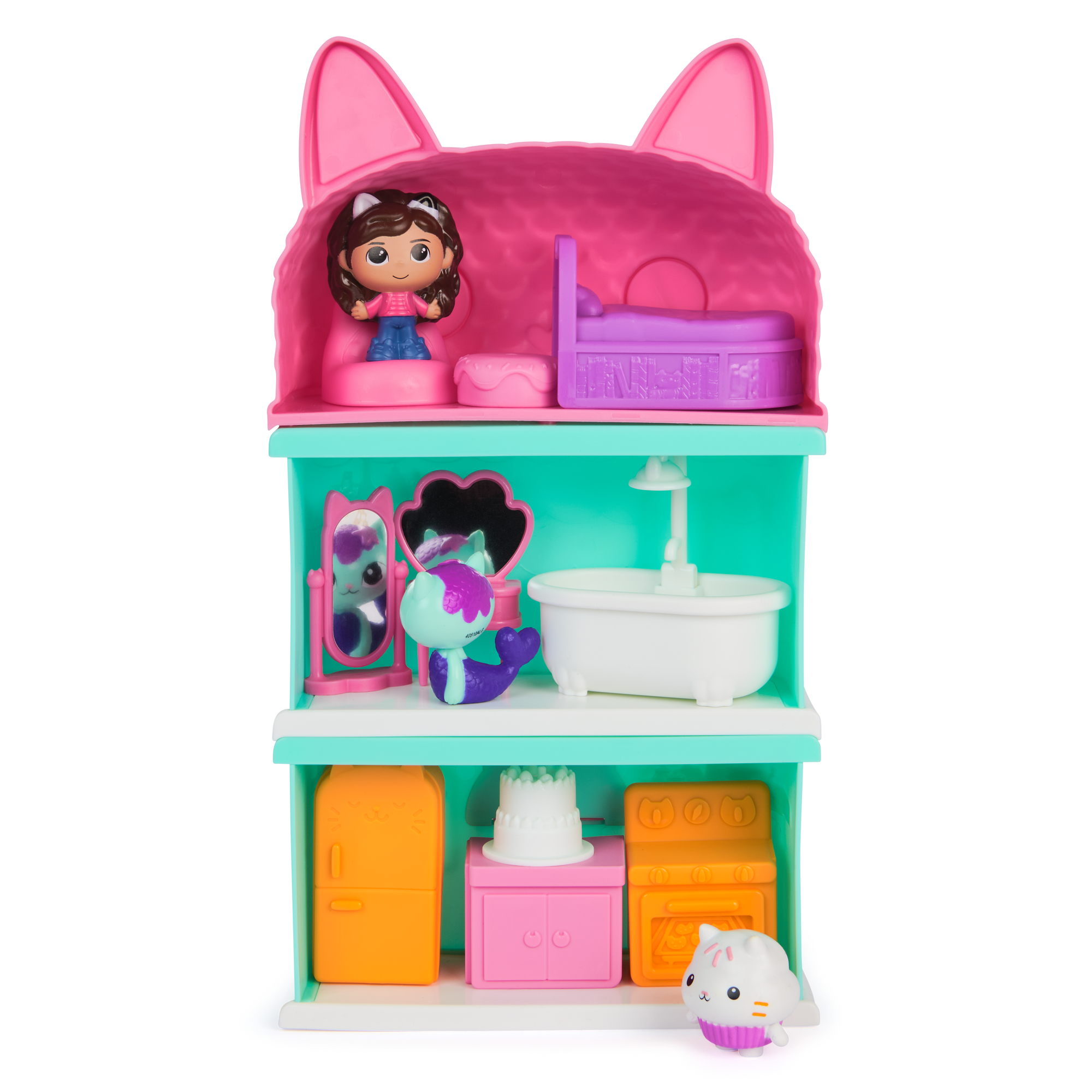 Postacie i akcesoria: zestaw zawiera minifigurki ulubionych bohaterów oraz drobne akcesoria, które urozmaicają zabawę: Syrenkotka, Gabi, Łakotek i mebelki do sypialni, łazienki i kuchni.