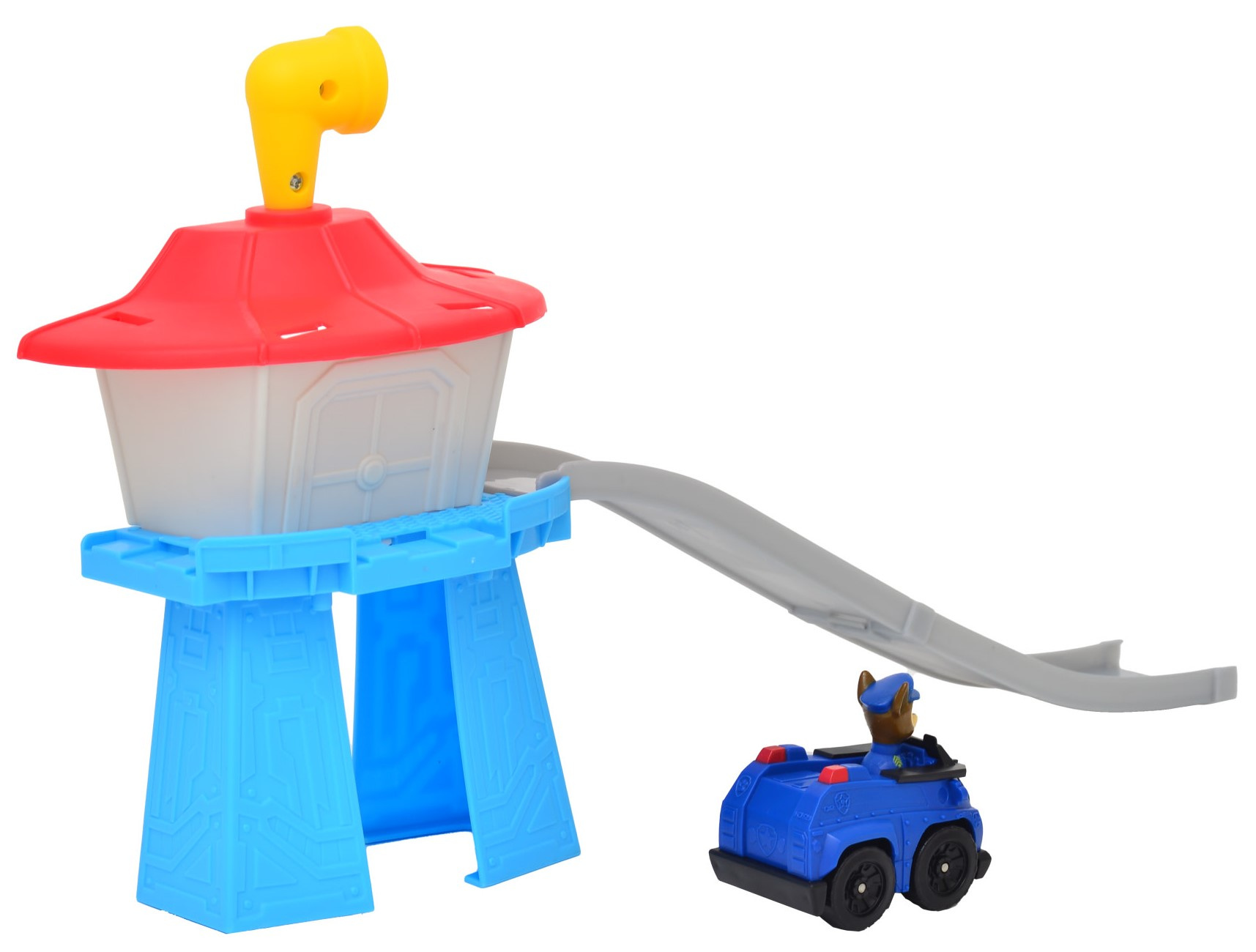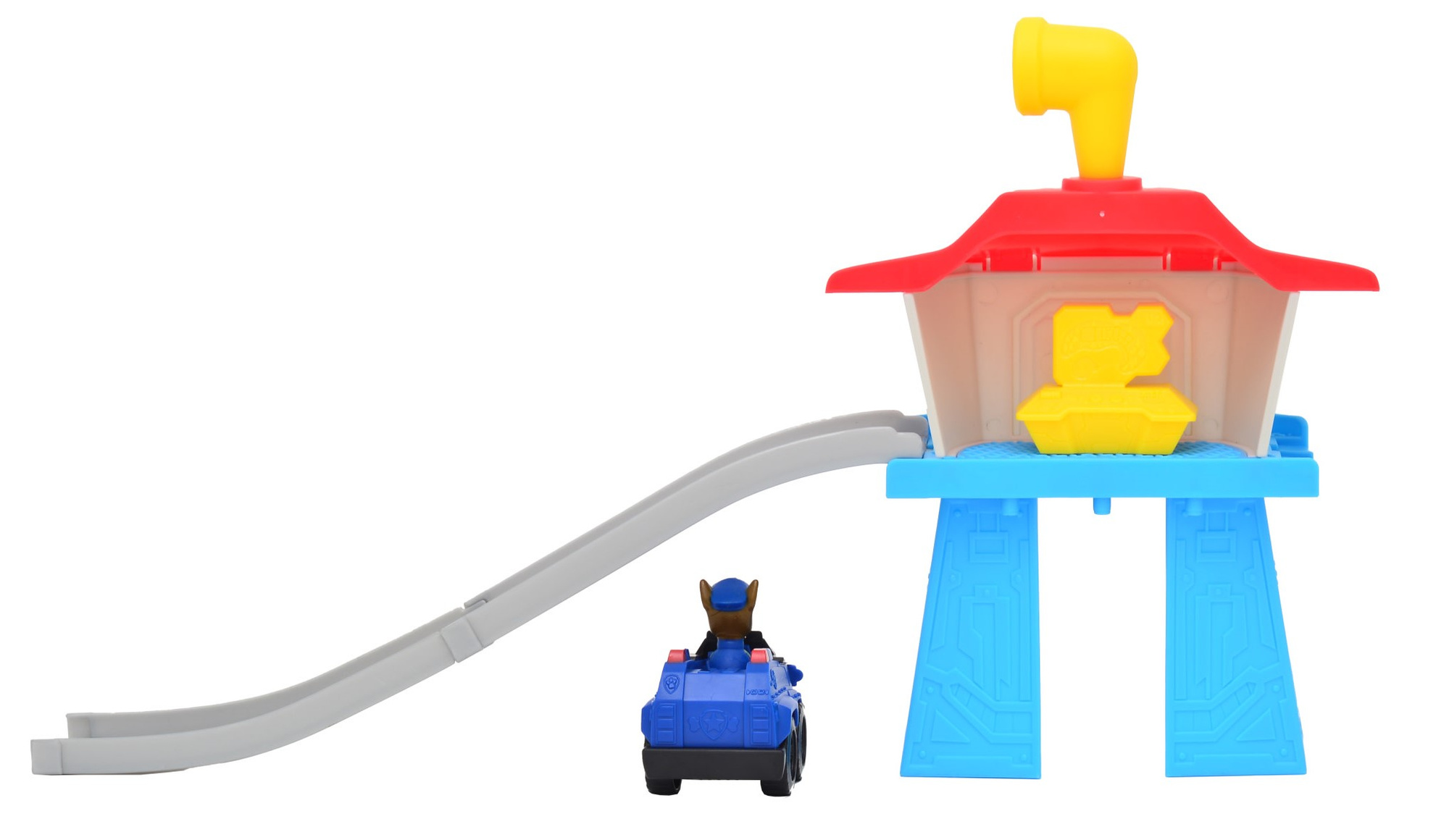 - Psi Patrol Mini wieża z torem zjazdowym i pojazdem Chase. Długość auta ok 5,5 cm, figurki nie można wyjąć z pojazdu.